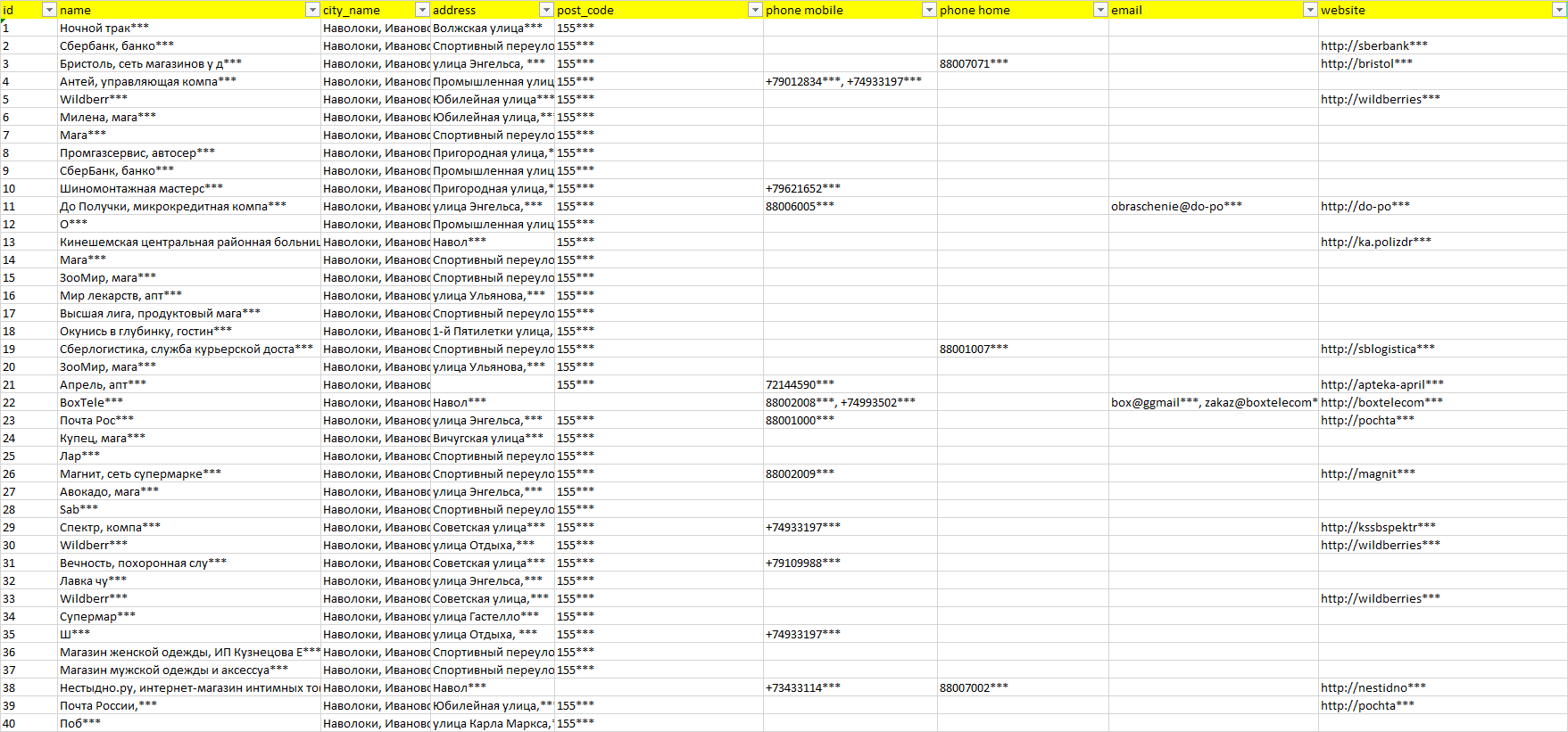 База организаций Наволоки, вся Россия в формате Excel с эл. почтами, телефонами, сайтами, ссылками на соц сети, координатами и другой информацией. Скачайте демо версию, чтобы ознакомиться с данными.
