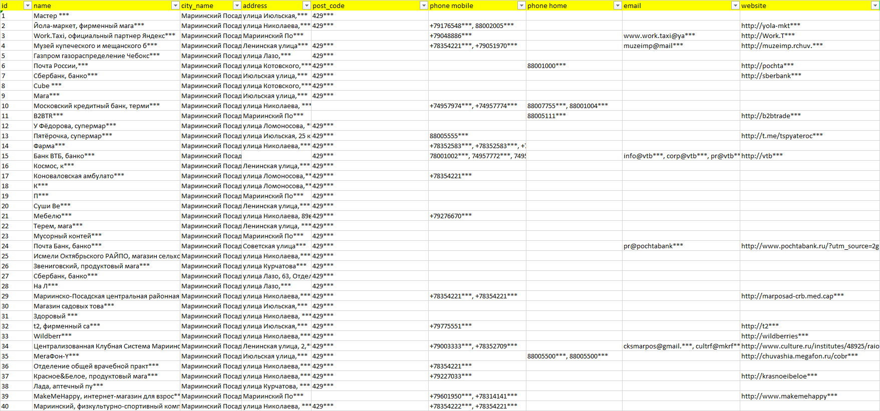 База компаний Мариинский Посад, вся РФ в формате Excel с эл. почтами, телефонами, сайтами, ссылками на соц сети, координатами и другой информацией. Скачайте демо версию, чтобы ознакомиться с данными.