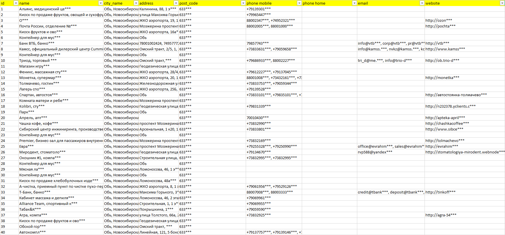 База компаний Обь, вся РФ в формате Excel с эл. почтами, телефонами, сайтами, ссылками на соц сети, координатами и другой информацией. Скачайте демо версию, чтобы ознакомиться с данными.