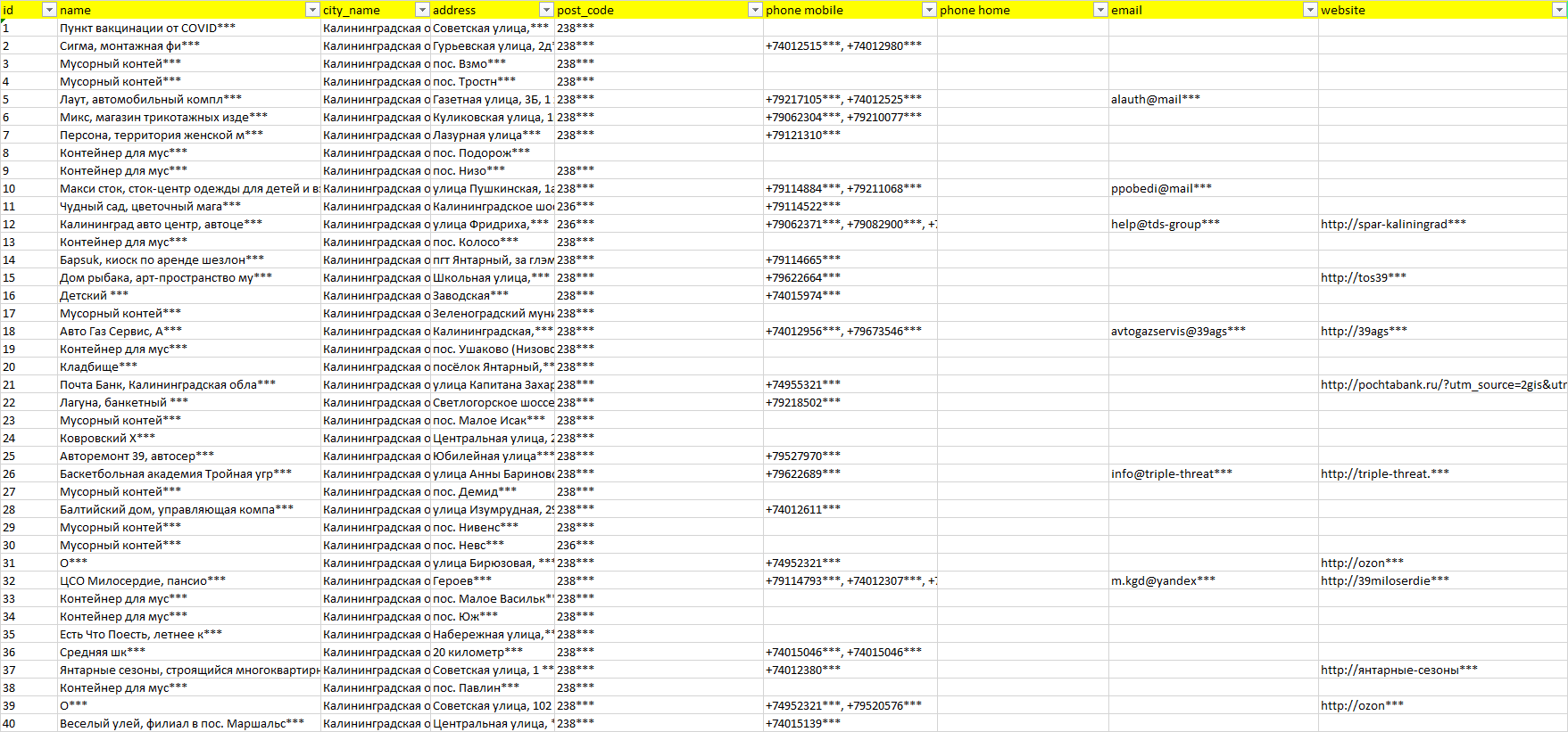 База компаний Калининградская область, вся РФ в формате Excel с эл. почтами, телефонами, сайтами, ссылками на соц сети, координатами и другой информацией. Скачайте демо версию, чтобы ознакомиться с данными.