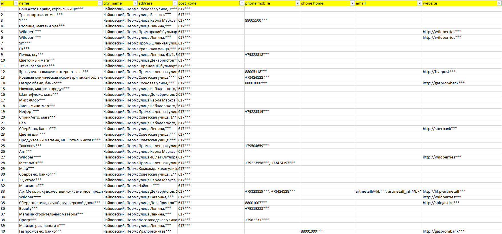 База компаний Чайковский, вся РФ в формате Excel с эл. почтами, телефонами, сайтами, ссылками на соц сети, координатами и другой информацией. Скачайте демо версию, чтобы ознакомиться с данными.