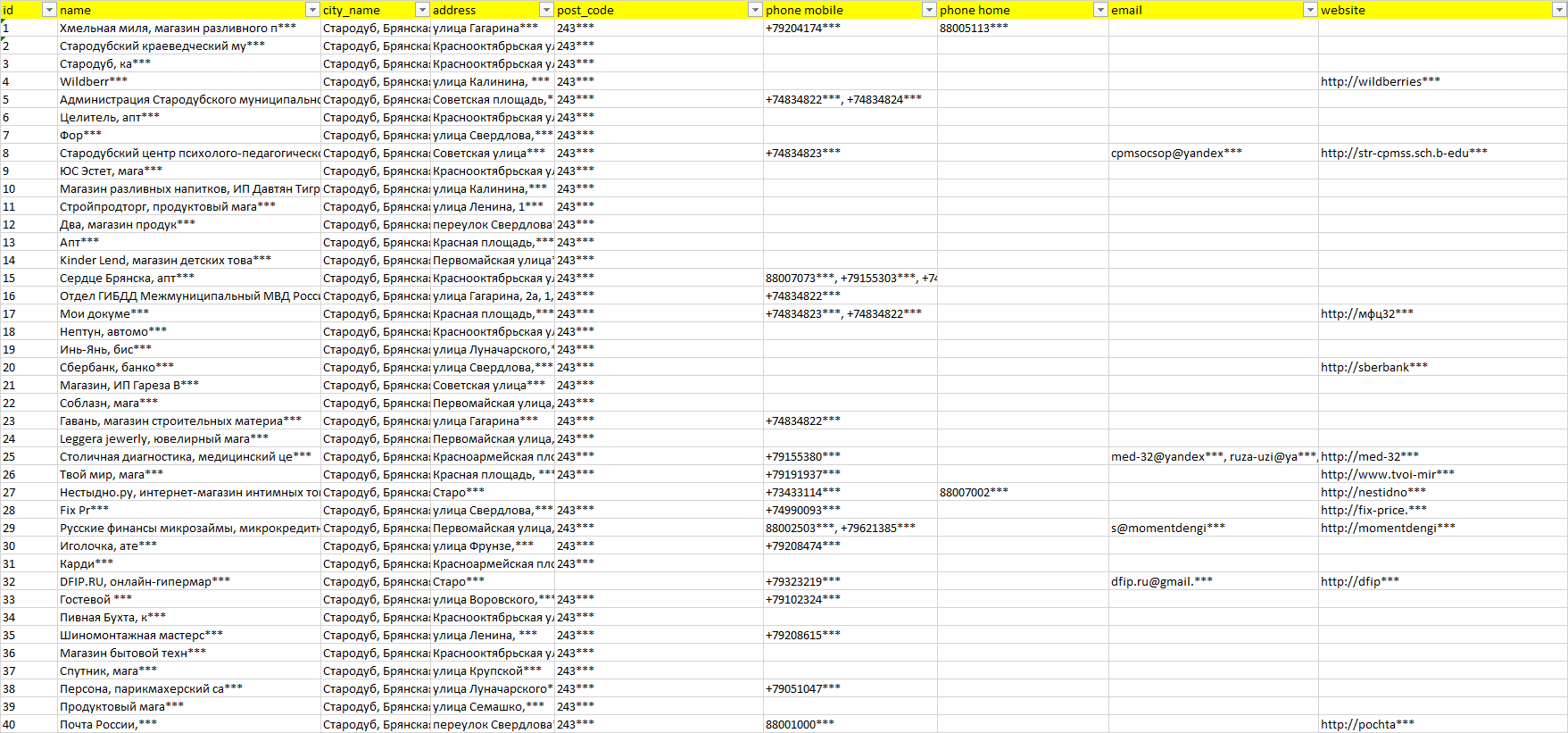 База компаний Стародуб, вся РФ в формате Excel с эл. почтами, телефонами, сайтами, ссылками на соц сети, координатами и другой информацией. Скачайте демо версию, чтобы ознакомиться с данными.
