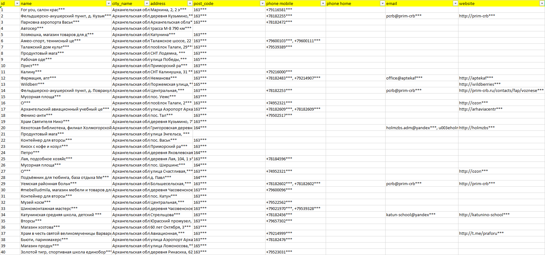 База компаний Архангельская область, вся РФ в формате Excel с эл. почтами, телефонами, сайтами, ссылками на соц сети, координатами и другой информацией. Скачайте демо версию, чтобы ознакомиться с данными.