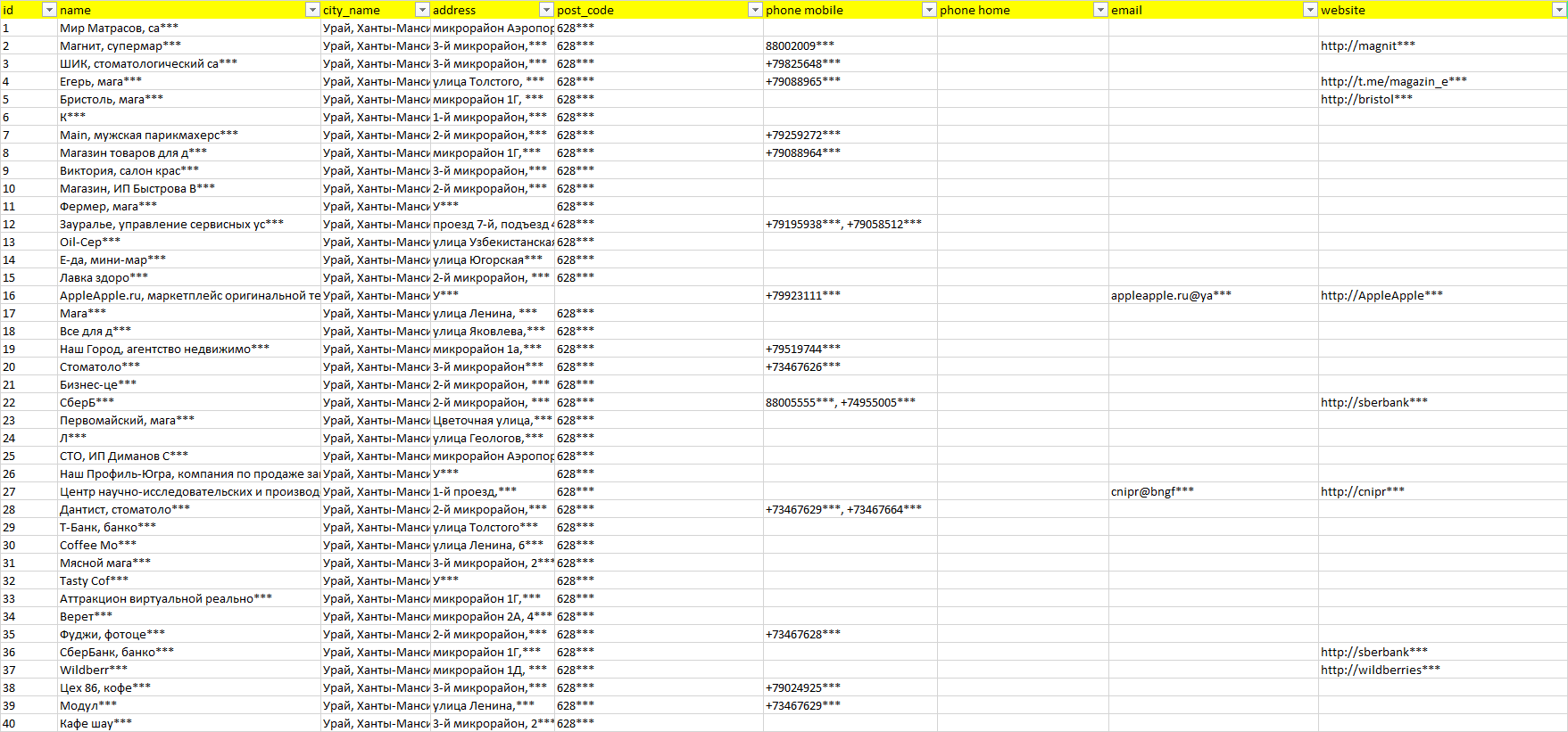 База компаний Урай, вся РФ в формате Excel с эл. почтами, телефонами, сайтами, ссылками на соц сети, координатами и другой информацией. Скачайте демо версию, чтобы ознакомиться с данными.
