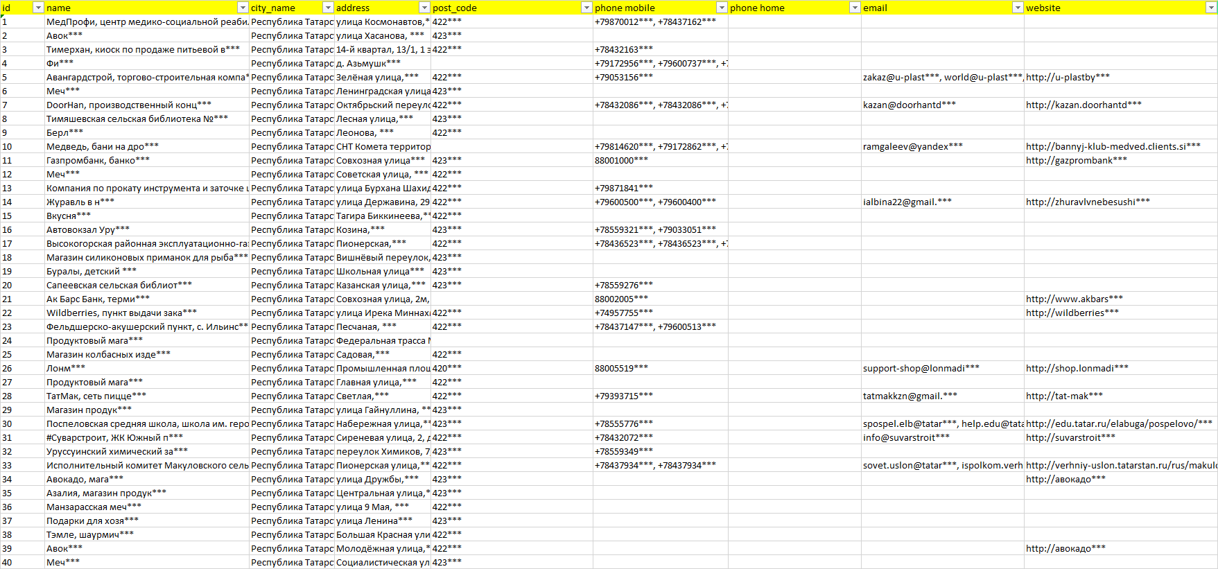 База компаний Республика Татарстан, вся РФ в формате Excel с эл. почтами, телефонами, сайтами, ссылками на соц сети, координатами и другой информацией. Скачайте демо версию, чтобы ознакомиться с данными.