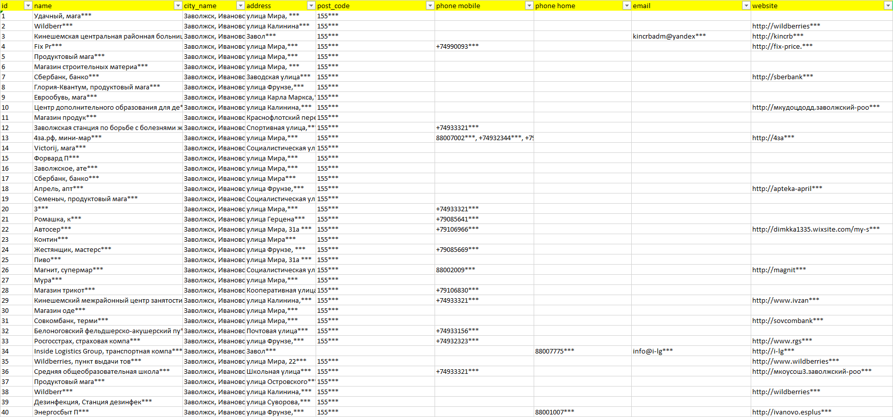 База организаций Заволжск, вся Россия в формате Excel с эл. почтами, телефонами, сайтами, ссылками на соц сети, координатами и другой информацией. Скачайте демо версию, чтобы ознакомиться с данными.