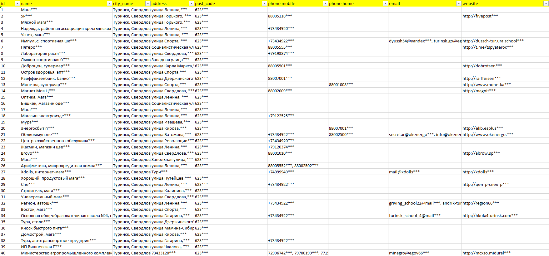 База компаний Туринск, вся РФ в формате Excel с эл. почтами, телефонами, сайтами, ссылками на соц сети, координатами и другой информацией. Скачайте демо версию, чтобы ознакомиться с данными.