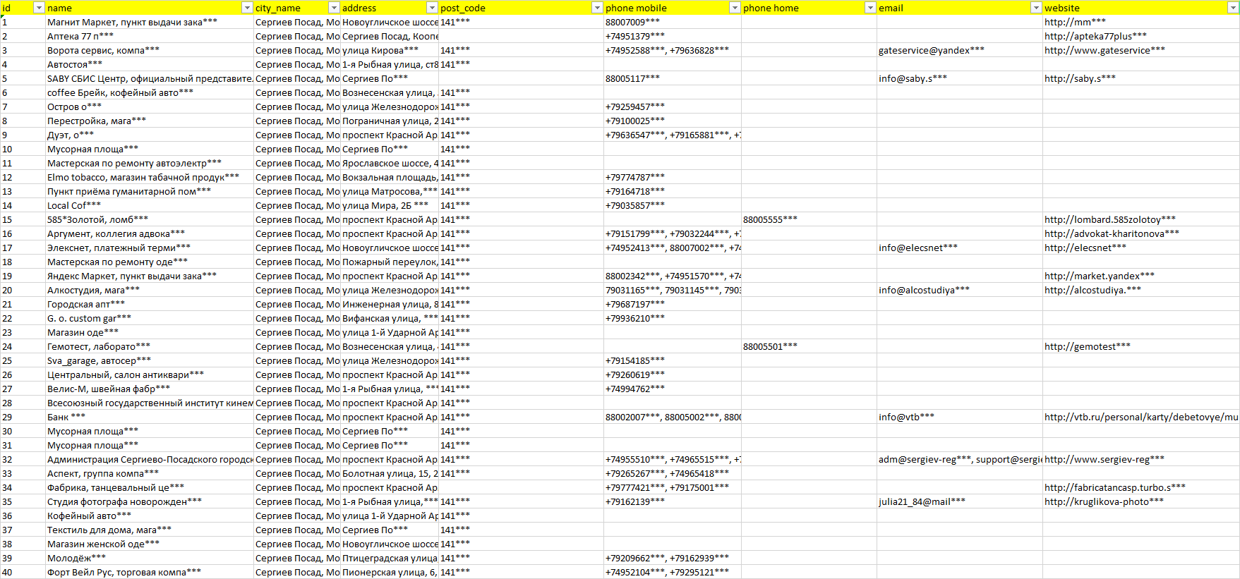 База компаний Сергиев Посад, вся РФ в формате Excel с эл. почтами, телефонами, сайтами, ссылками на соц сети, координатами и другой информацией. Скачайте демо версию, чтобы ознакомиться с данными.