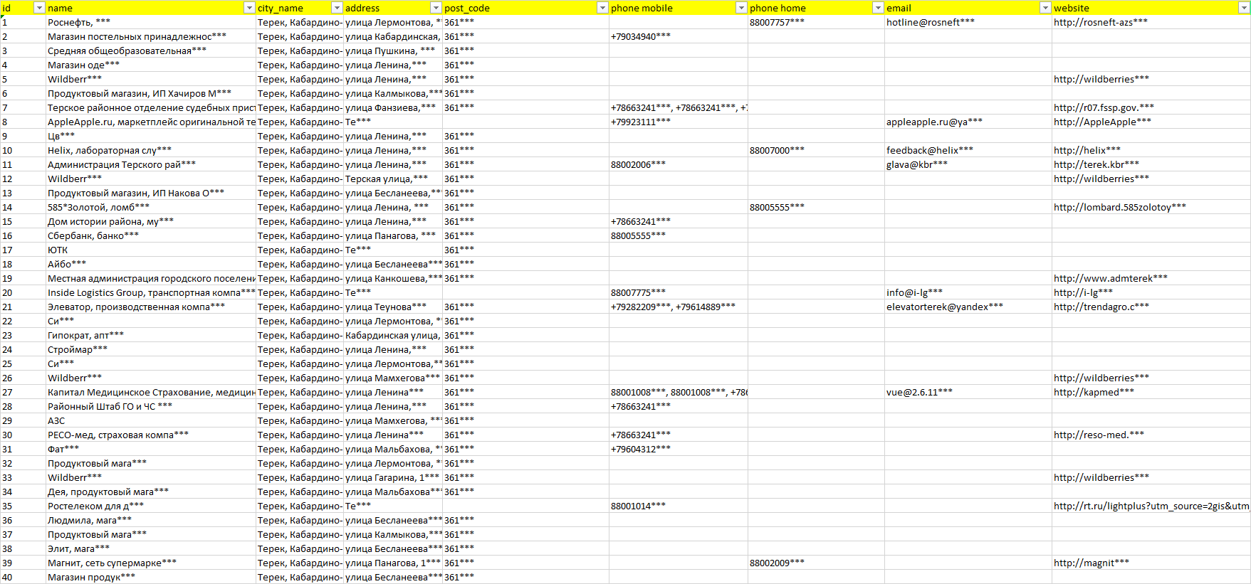 База компаний Терек, вся РФ в формате Excel с эл. почтами, телефонами, сайтами, ссылками на соц сети, координатами и другой информацией. Скачайте демо версию, чтобы ознакомиться с данными.