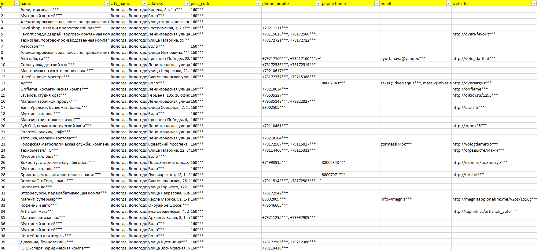 База организаций Вологда, вся Россия в формате Excel с эл. почтами, телефонами, сайтами, ссылками на соц сети, координатами и другой информацией. Скачайте демо версию, чтобы ознакомиться с данными.