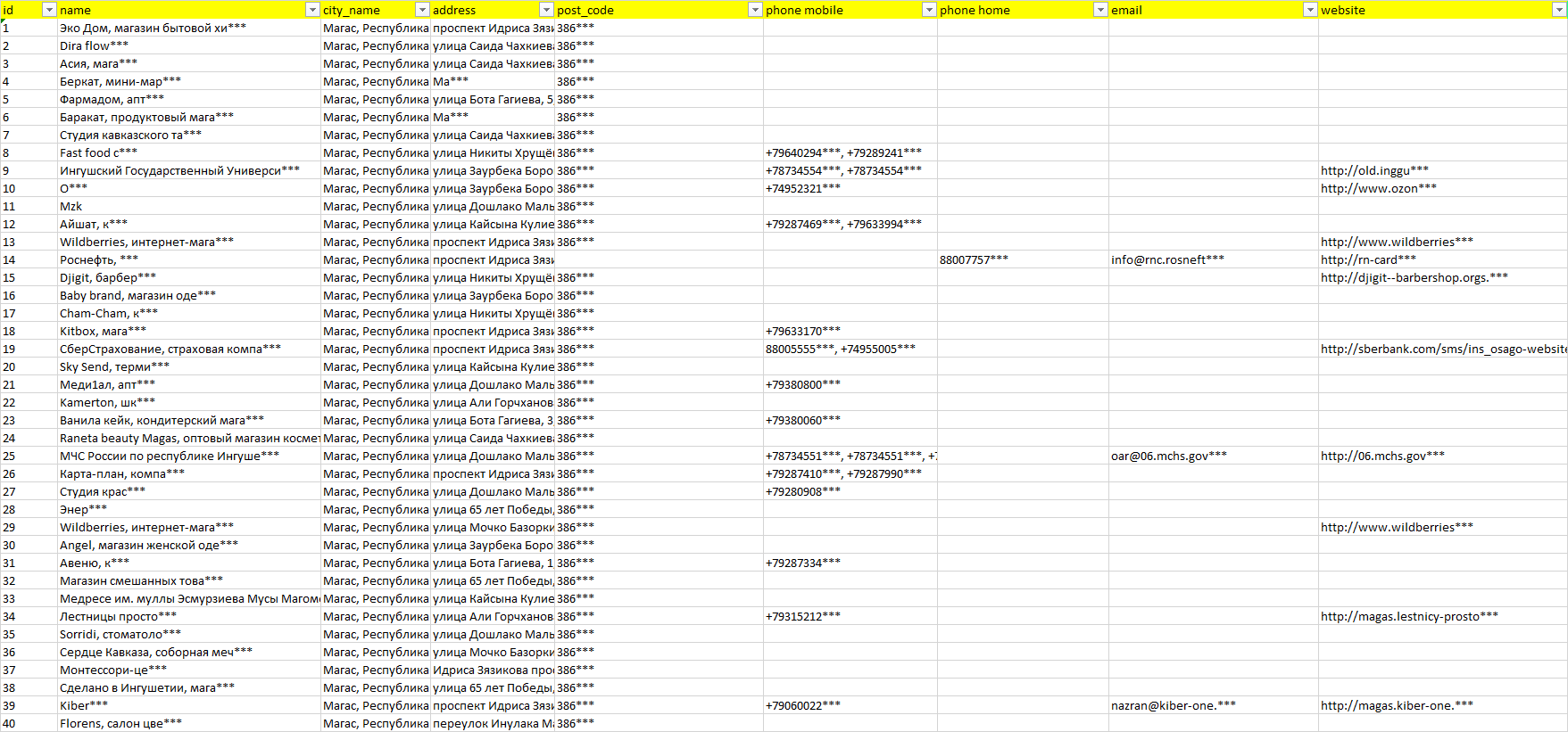 База организаций Магас, вся Россия в формате Excel с эл. почтами, телефонами, сайтами, ссылками на соц сети, координатами и другой информацией. Скачайте демо версию, чтобы ознакомиться с данными.