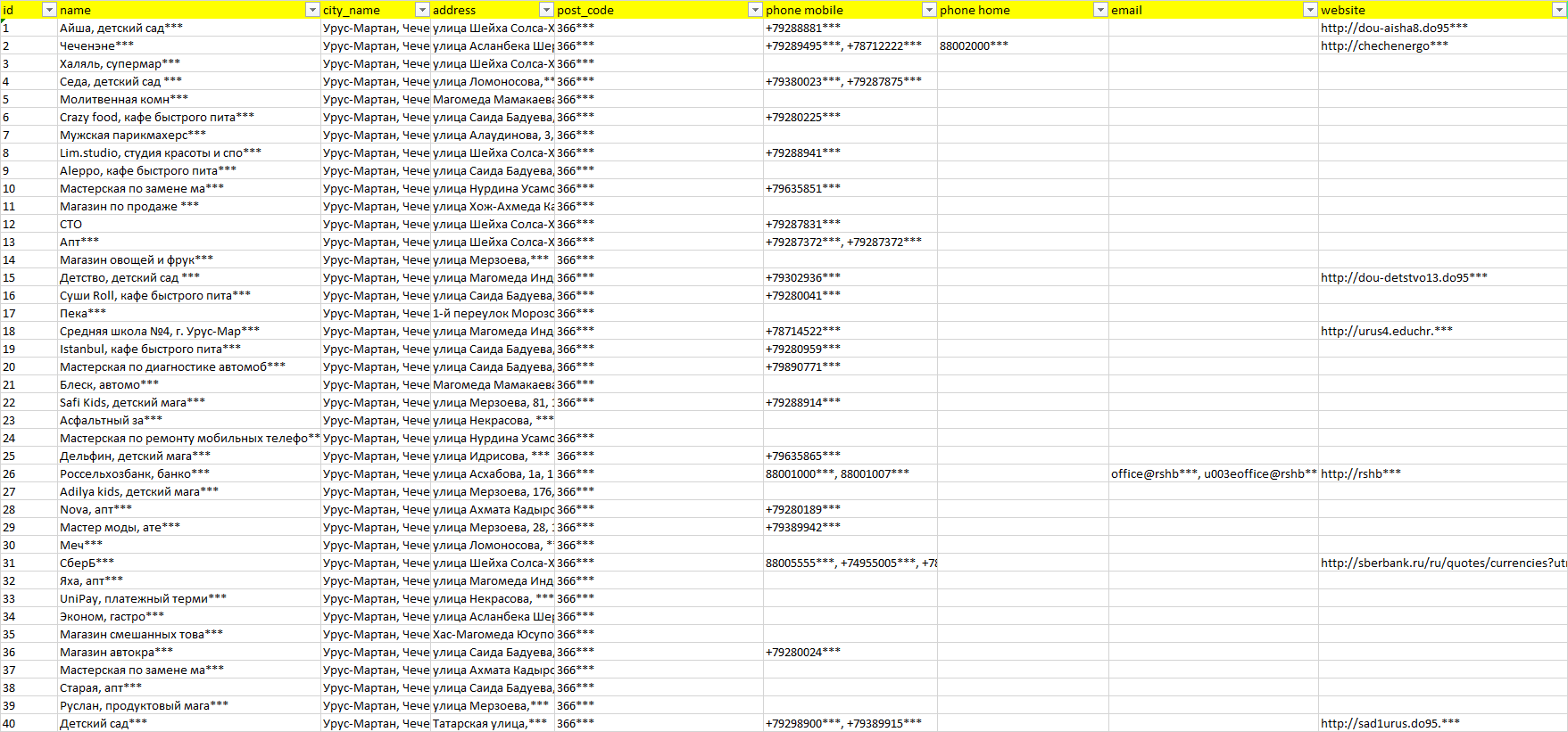 База компаний Урус-Мартан, вся РФ в формате Excel с эл. почтами, телефонами, сайтами, ссылками на соц сети, координатами и другой информацией. Скачайте демо версию, чтобы ознакомиться с данными.