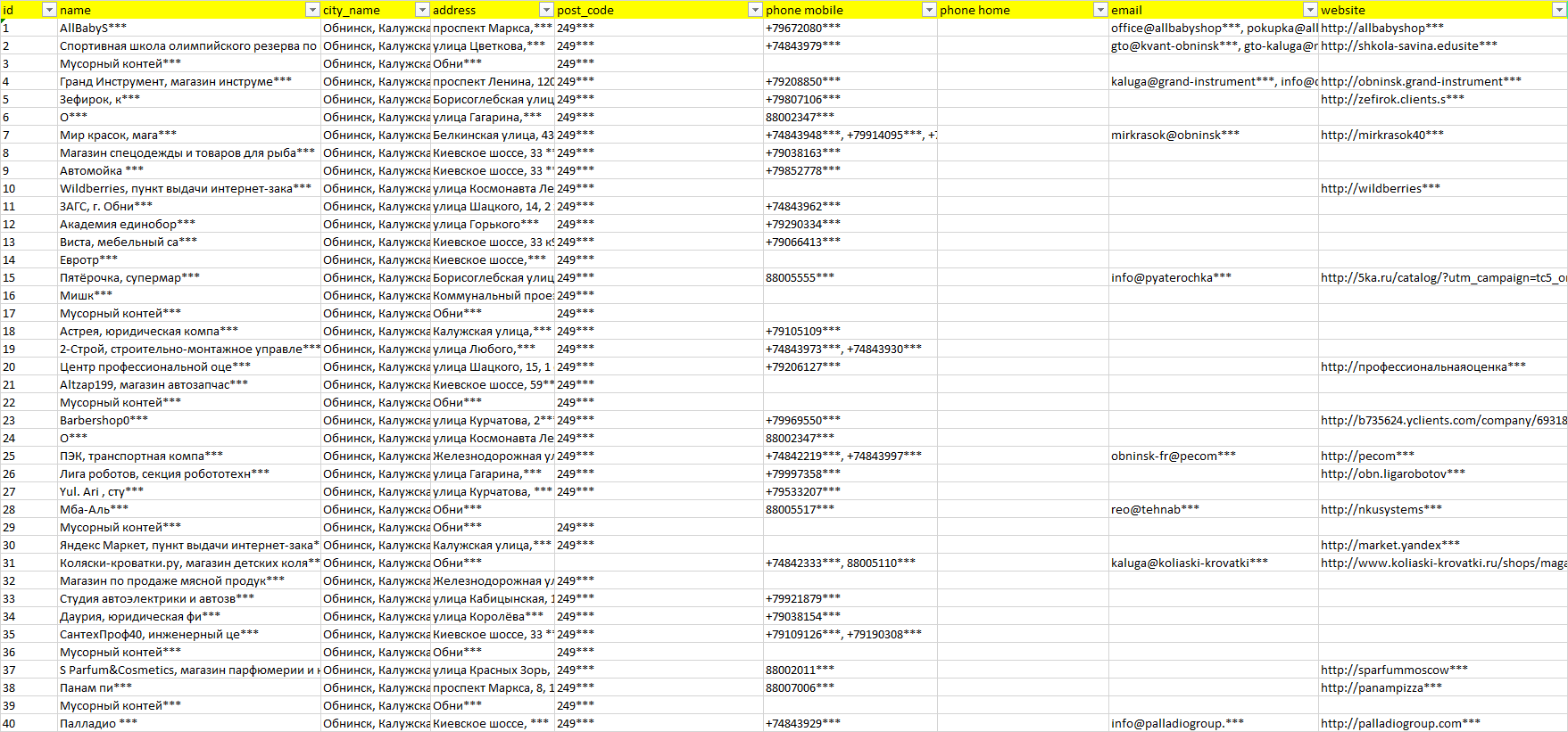 База организаций Обнинск, вся Россия в формате Excel с эл. почтами, телефонами, сайтами, ссылками на соц сети, координатами и другой информацией. Скачайте демо версию, чтобы ознакомиться с данными.