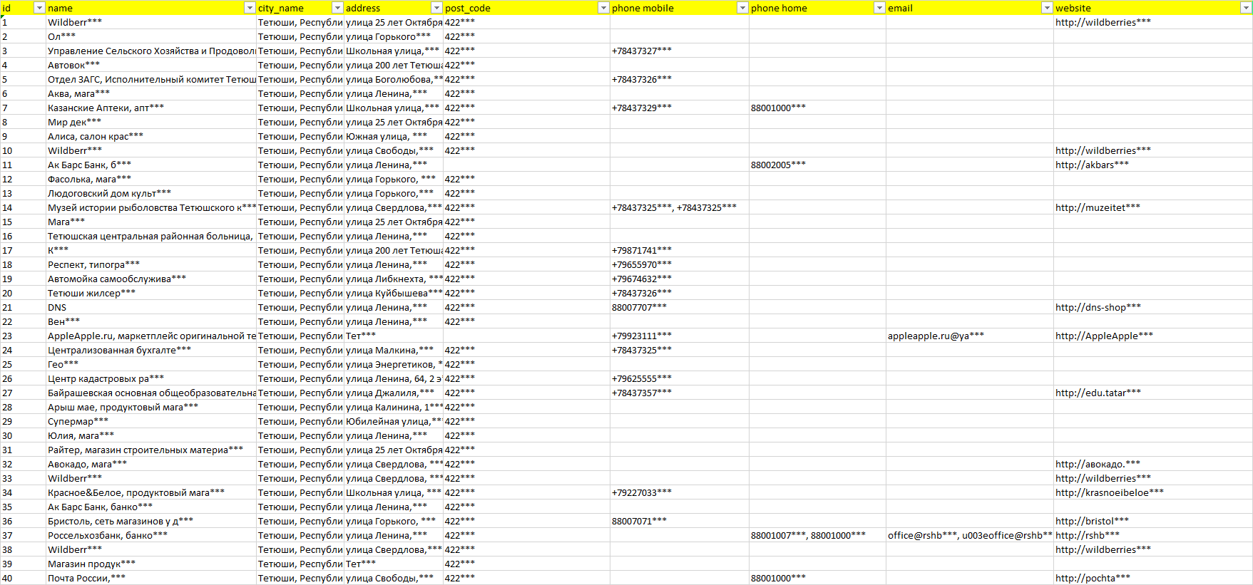 База организаций Тетюши, вся Россия в формате Excel с эл. почтами, телефонами, сайтами, ссылками на соц сети, координатами и другой информацией. Скачайте демо версию, чтобы ознакомиться с данными.