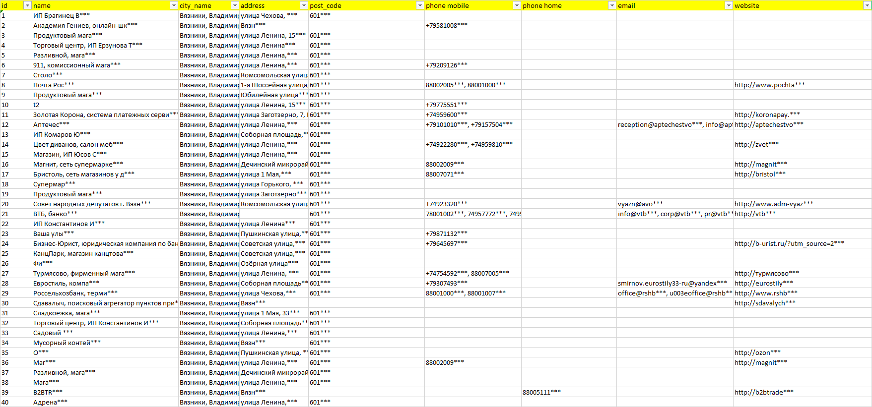 База организаций Вязники, вся Россия в формате Excel с эл. почтами, телефонами, сайтами, ссылками на соц сети, координатами и другой информацией. Скачайте демо версию, чтобы ознакомиться с данными.