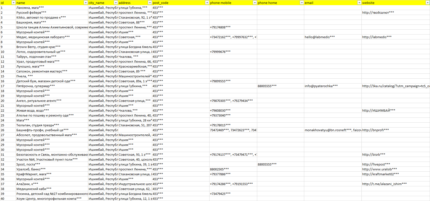 База компаний Ишимбай, вся РФ в формате Excel с эл. почтами, телефонами, сайтами, ссылками на соц сети, координатами и другой информацией. Скачайте демо версию, чтобы ознакомиться с данными.