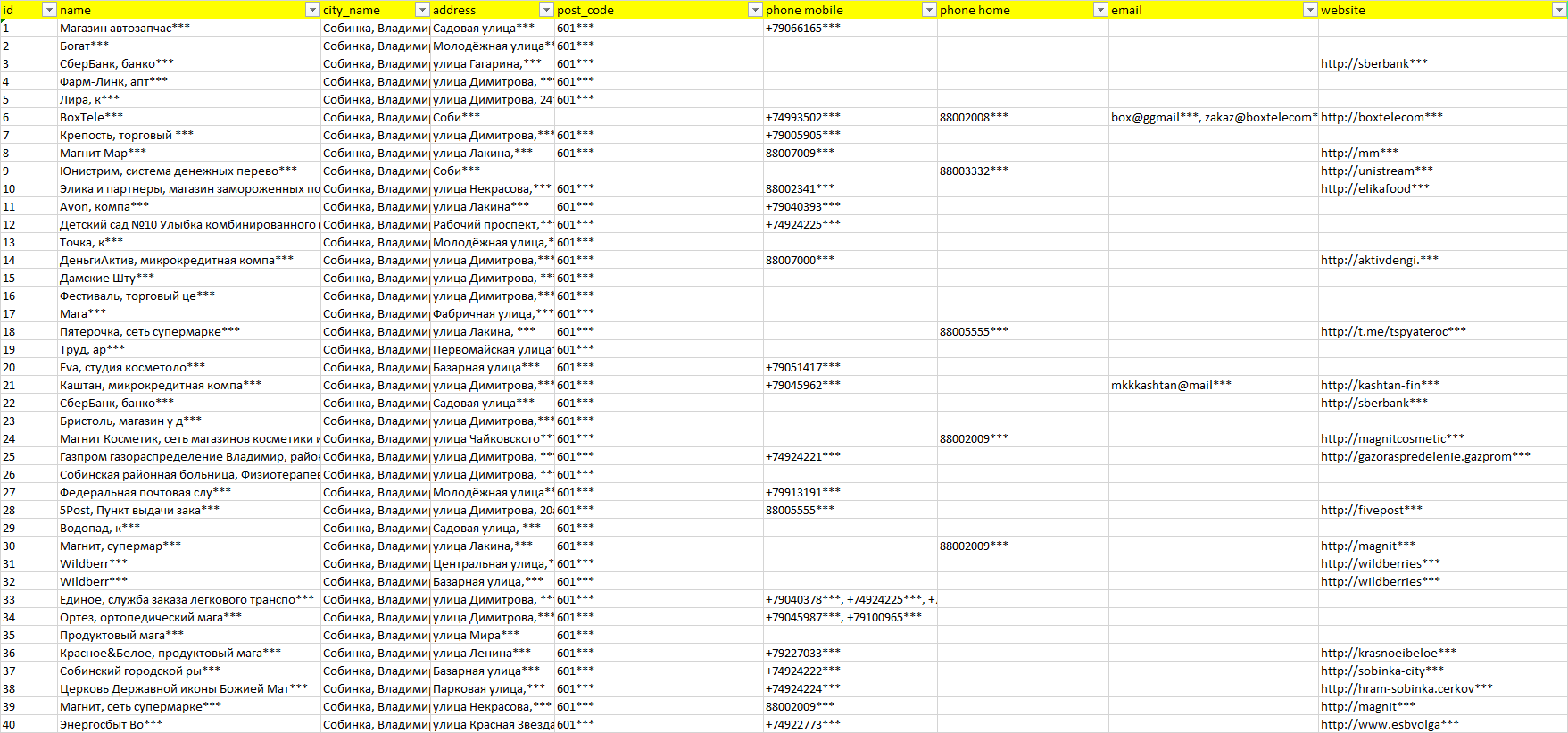 База организаций Собинка, вся Россия в формате Excel с эл. почтами, телефонами, сайтами, ссылками на соц сети, координатами и другой информацией. Скачайте демо версию, чтобы ознакомиться с данными.
