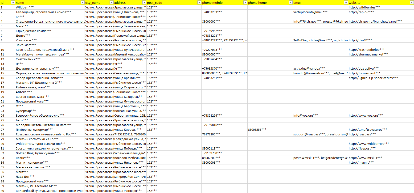 База организаций Углич, вся Россия в формате Excel с эл. почтами, телефонами, сайтами, ссылками на соц сети, координатами и другой информацией. Скачайте демо версию, чтобы ознакомиться с данными.