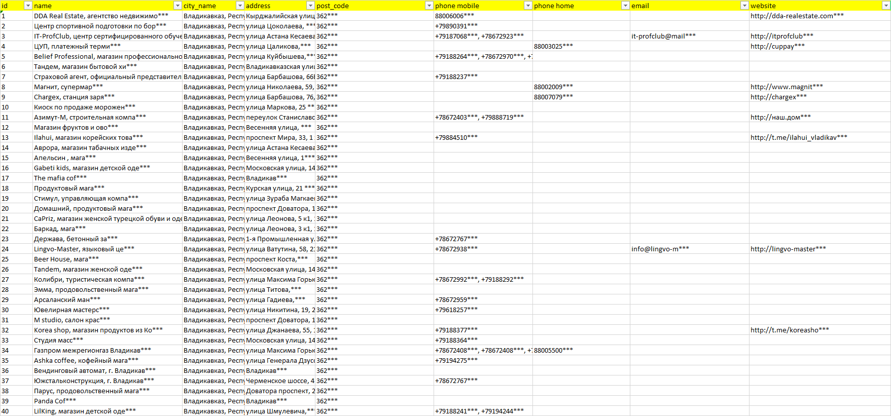 База организаций Владикавказ, вся Россия в формате Excel с эл. почтами, телефонами, сайтами, ссылками на соц сети, координатами и другой информацией. Скачайте демо версию, чтобы ознакомиться с данными.