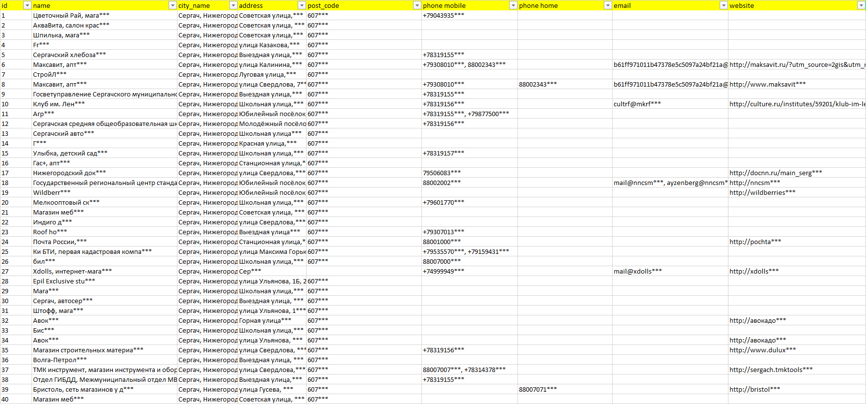 База компаний Сергач, вся РФ в формате Excel с эл. почтами, телефонами, сайтами, ссылками на соц сети, координатами и другой информацией. Скачайте демо версию, чтобы ознакомиться с данными.