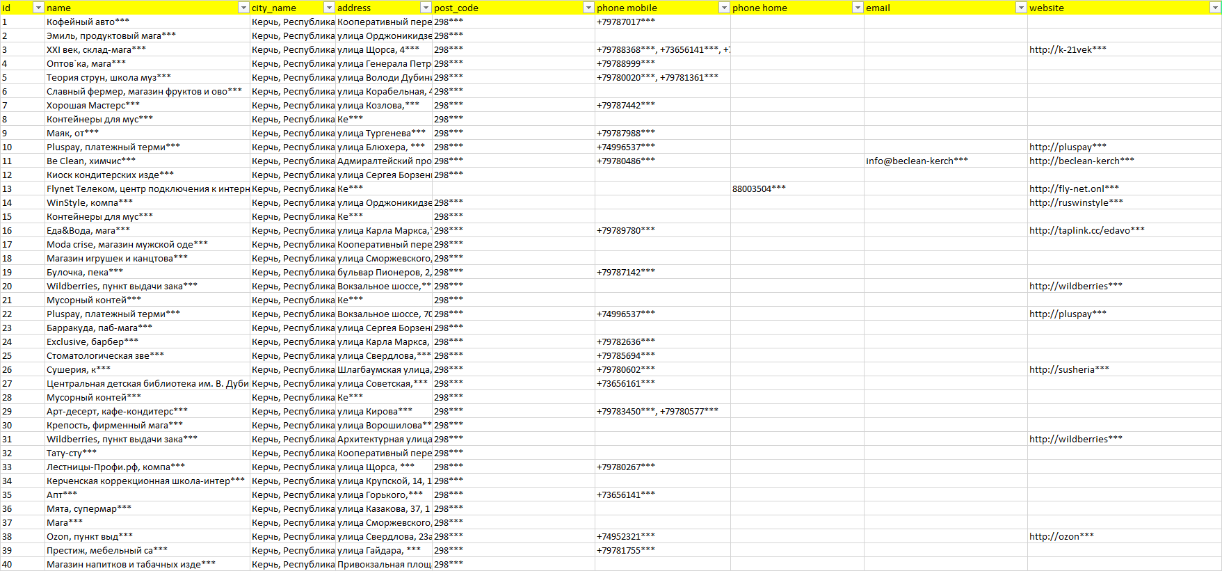 База компаний Керчь, вся РФ в формате Excel с эл. почтами, телефонами, сайтами, ссылками на соц сети, координатами и другой информацией. Скачайте демо версию, чтобы ознакомиться с данными.