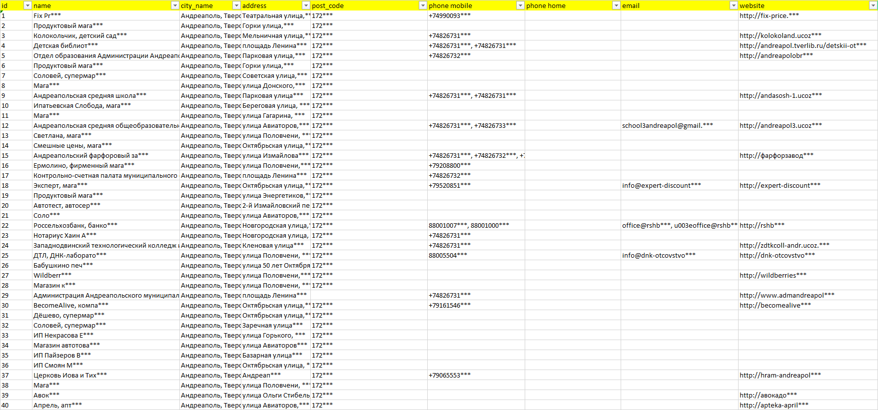 База организаций Андреаполь, вся Россия в формате Excel с эл. почтами, телефонами, сайтами, ссылками на соц сети, координатами и другой информацией. Скачайте демо версию, чтобы ознакомиться с данными.