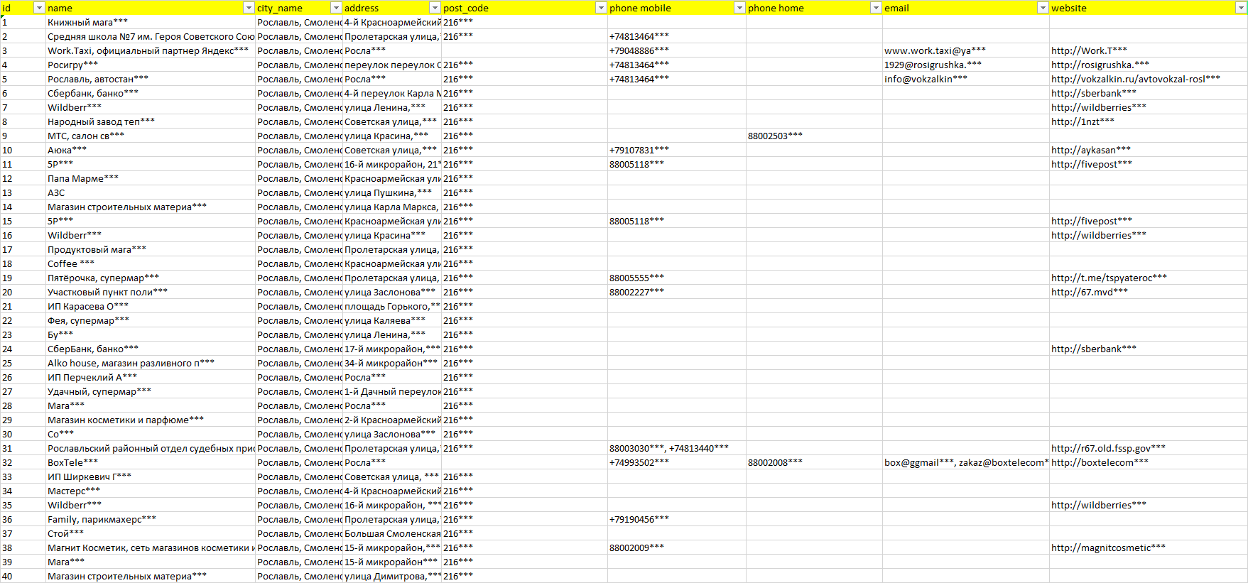 База компаний Рославль, вся РФ в формате Excel с эл. почтами, телефонами, сайтами, ссылками на соц сети, координатами и другой информацией. Скачайте демо версию, чтобы ознакомиться с данными.