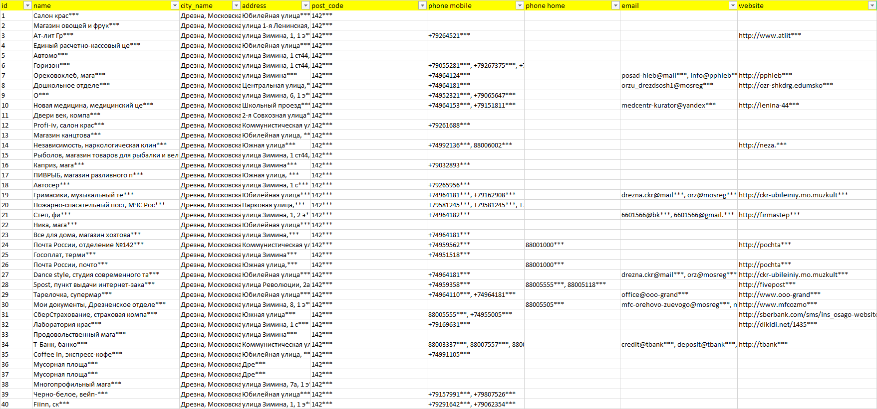 База организаций Дрезна, вся Россия в формате Excel с эл. почтами, телефонами, сайтами, ссылками на соц сети, координатами и другой информацией. Скачайте демо версию, чтобы ознакомиться с данными.