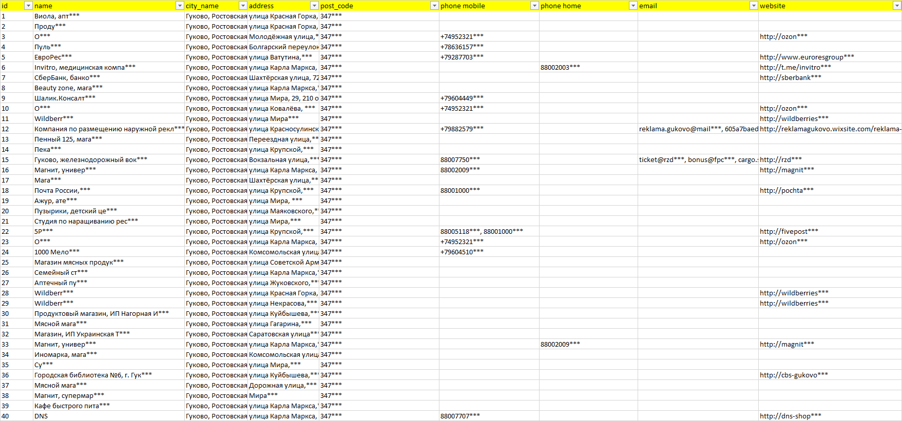 База компаний Гуково, вся РФ в формате Excel с эл. почтами, телефонами, сайтами, ссылками на соц сети, координатами и другой информацией. Скачайте демо версию, чтобы ознакомиться с данными.