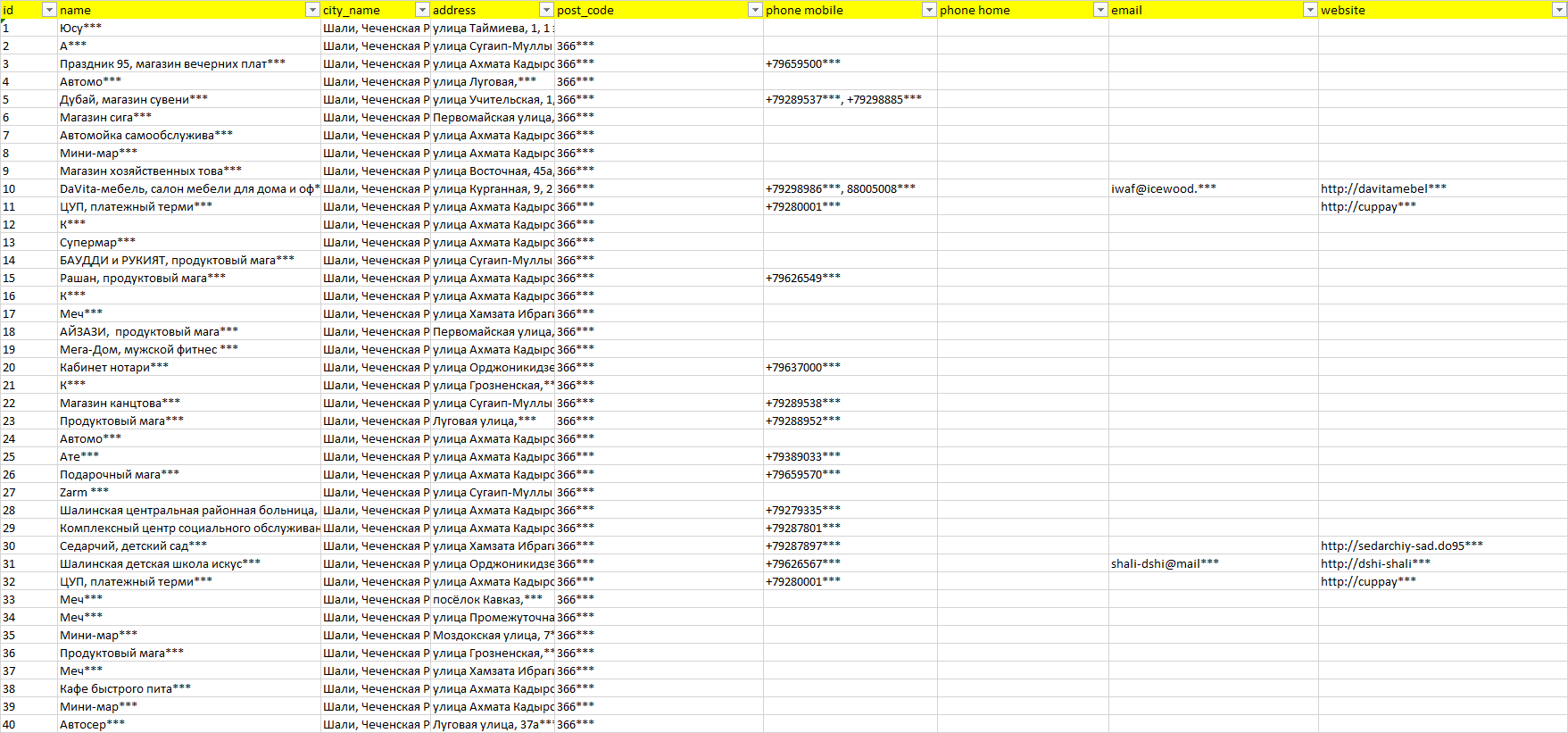 База компаний Шали, вся РФ в формате Excel с эл. почтами, телефонами, сайтами, ссылками на соц сети, координатами и другой информацией. Скачайте демо версию, чтобы ознакомиться с данными.