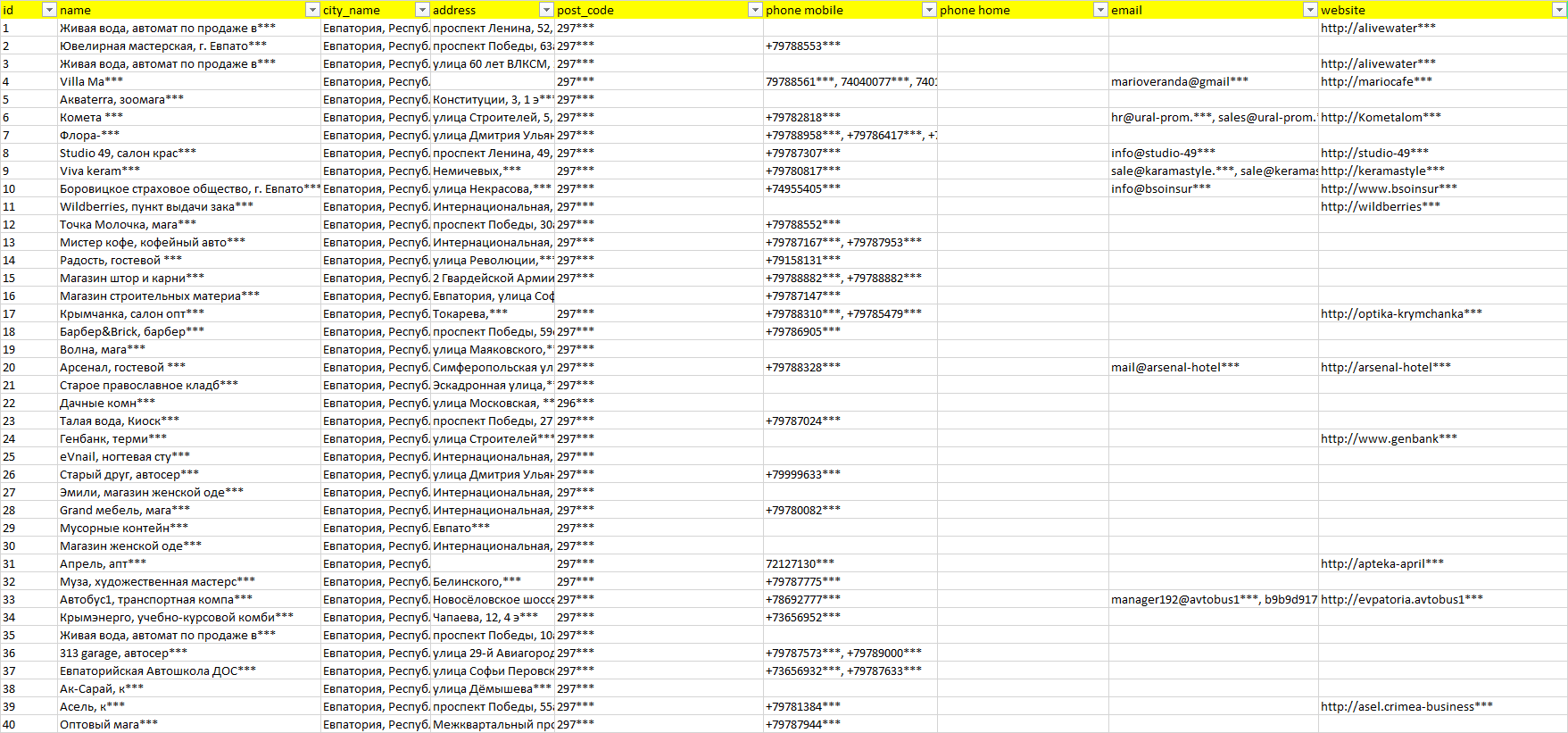База компаний Евпатория, вся РФ в формате Excel с эл. почтами, телефонами, сайтами, ссылками на соц сети, координатами и другой информацией. Скачайте демо версию, чтобы ознакомиться с данными.