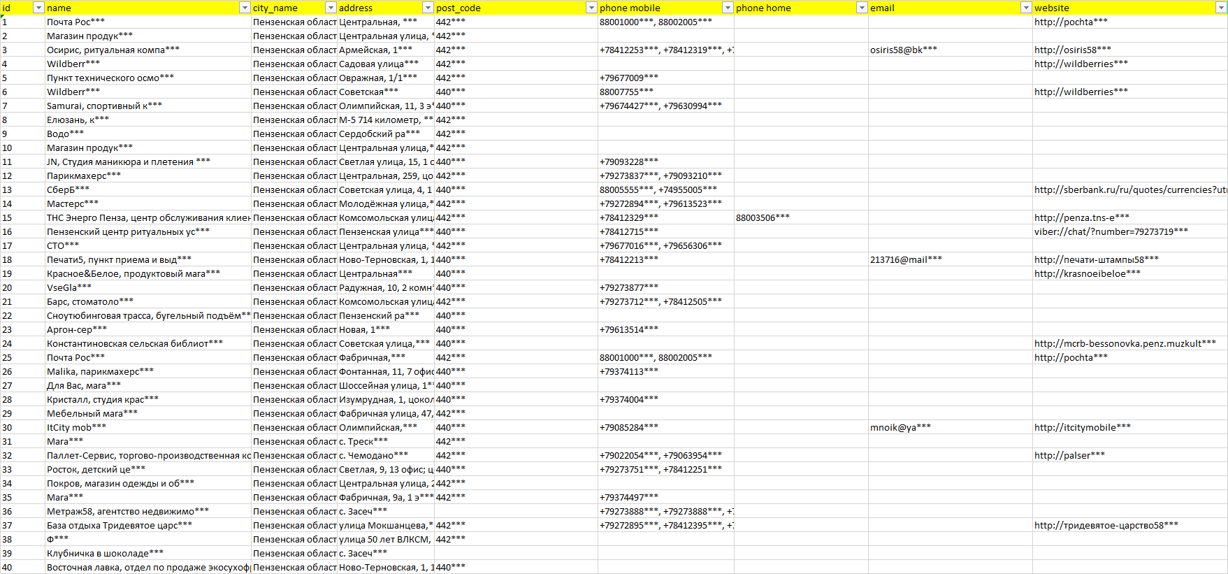 База организаций Пензенская область, вся Россия в формате Excel с эл. почтами, телефонами, сайтами, ссылками на соц сети, координатами и другой информацией. Скачайте демо версию, чтобы ознакомиться с данными.