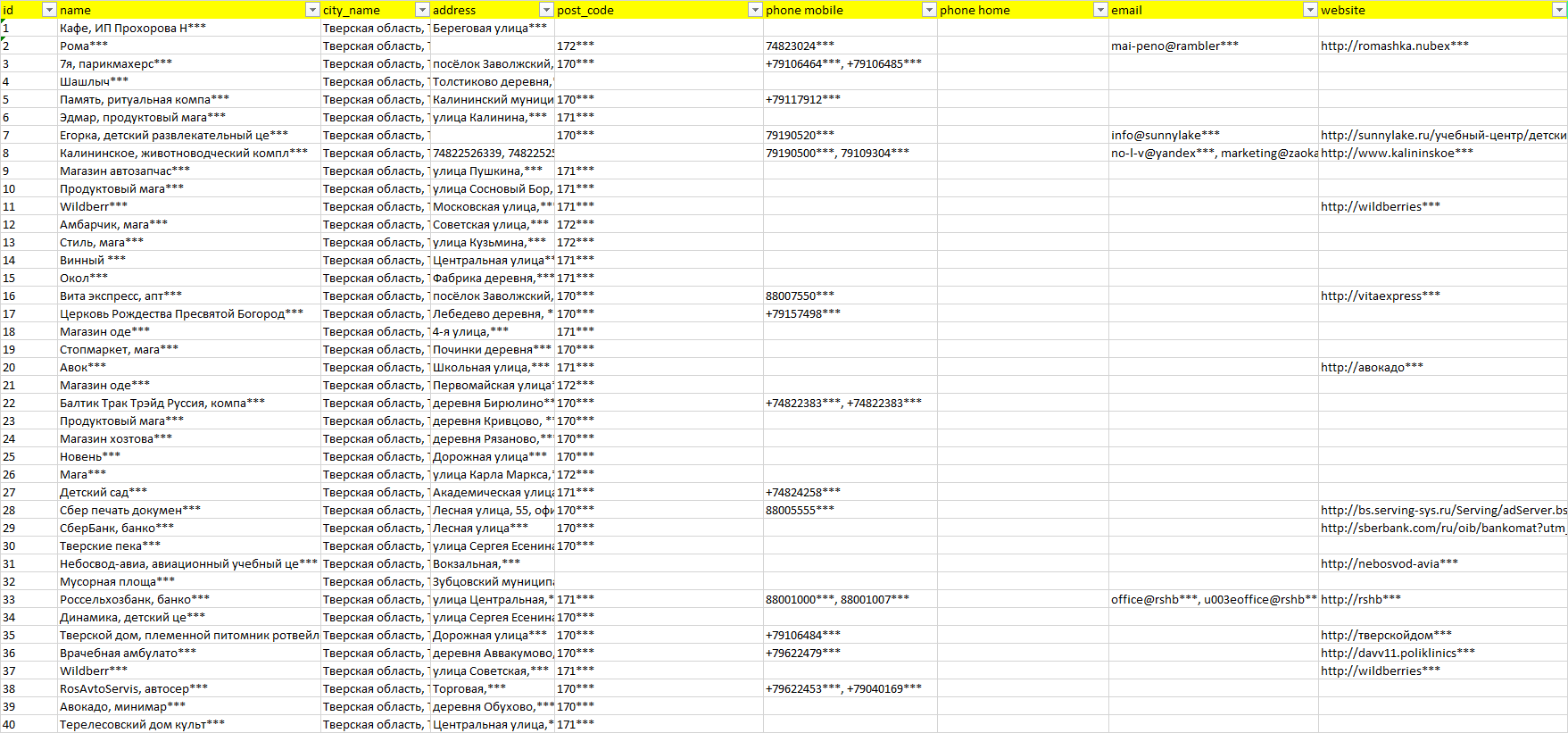 База организаций Тверская область, вся Россия в формате Excel с эл. почтами, телефонами, сайтами, ссылками на соц сети, координатами и другой информацией. Скачайте демо версию, чтобы ознакомиться с данными.