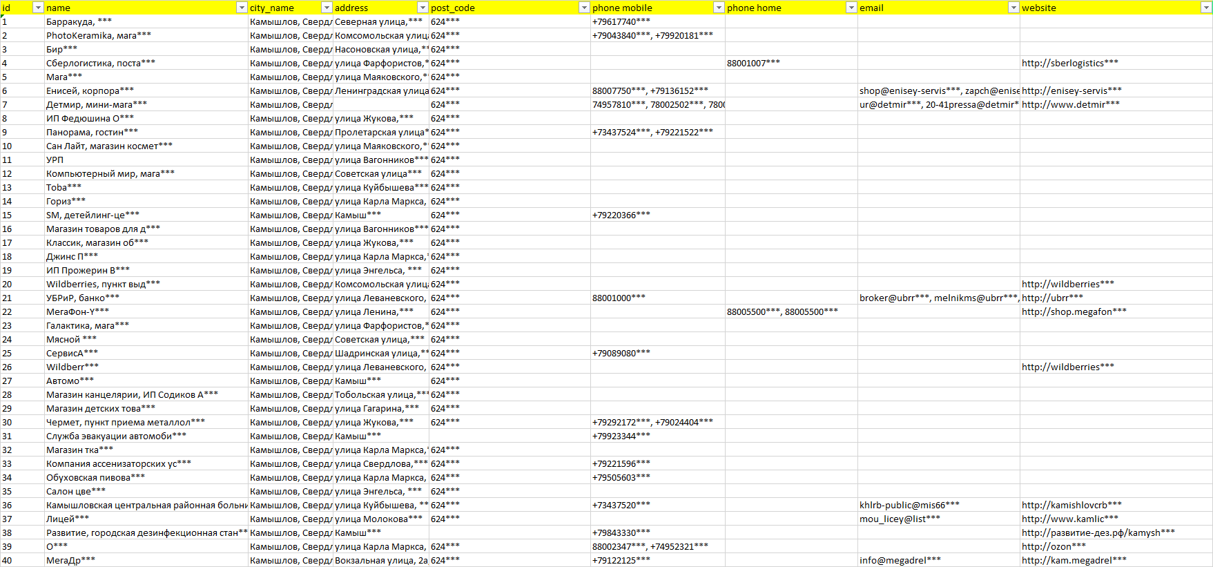База компаний Камышлов, вся РФ в формате Excel с эл. почтами, телефонами, сайтами, ссылками на соц сети, координатами и другой информацией. Скачайте демо версию, чтобы ознакомиться с данными.