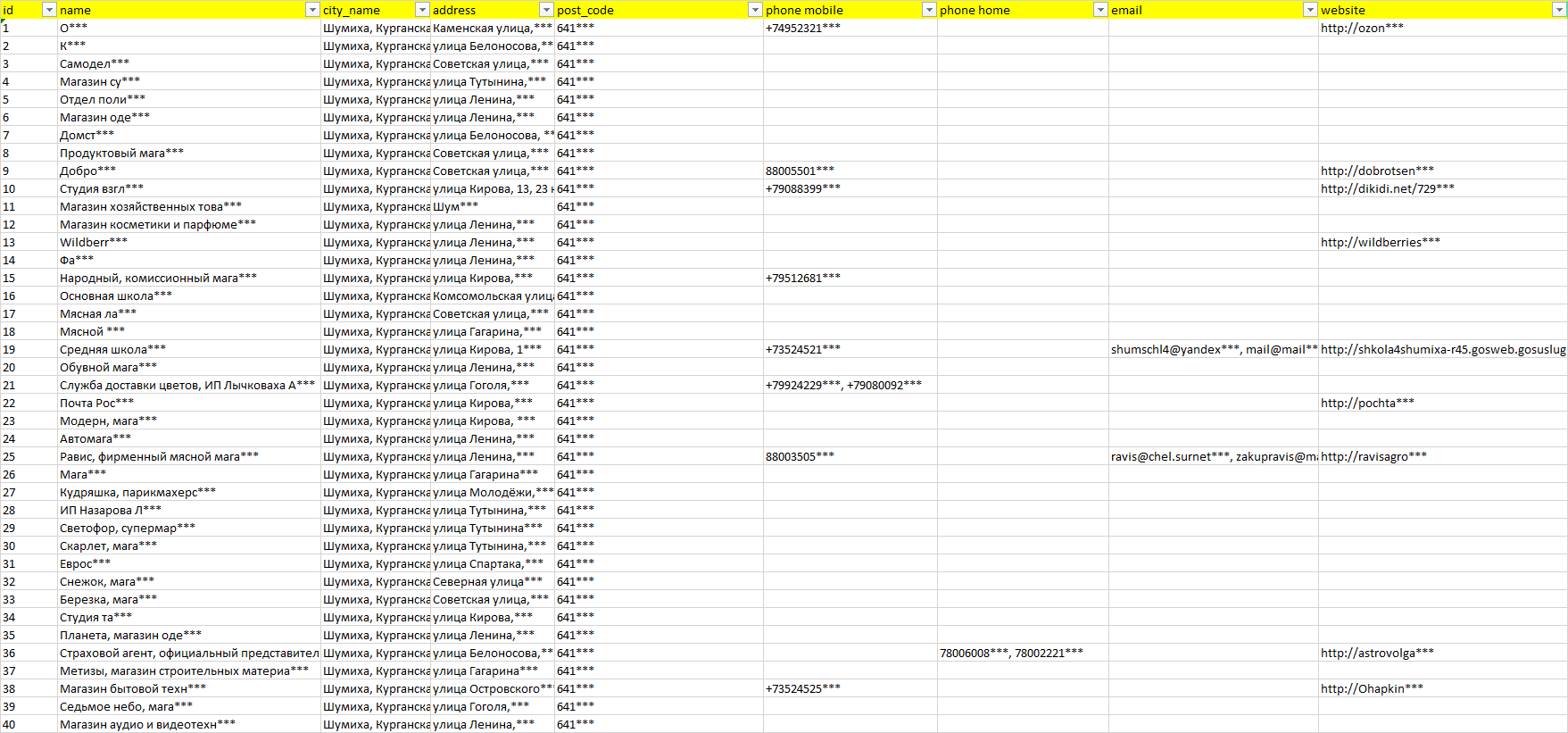 База организаций Шумиха, вся Россия в формате Excel с эл. почтами, телефонами, сайтами, ссылками на соц сети, координатами и другой информацией. Скачайте демо версию, чтобы ознакомиться с данными.