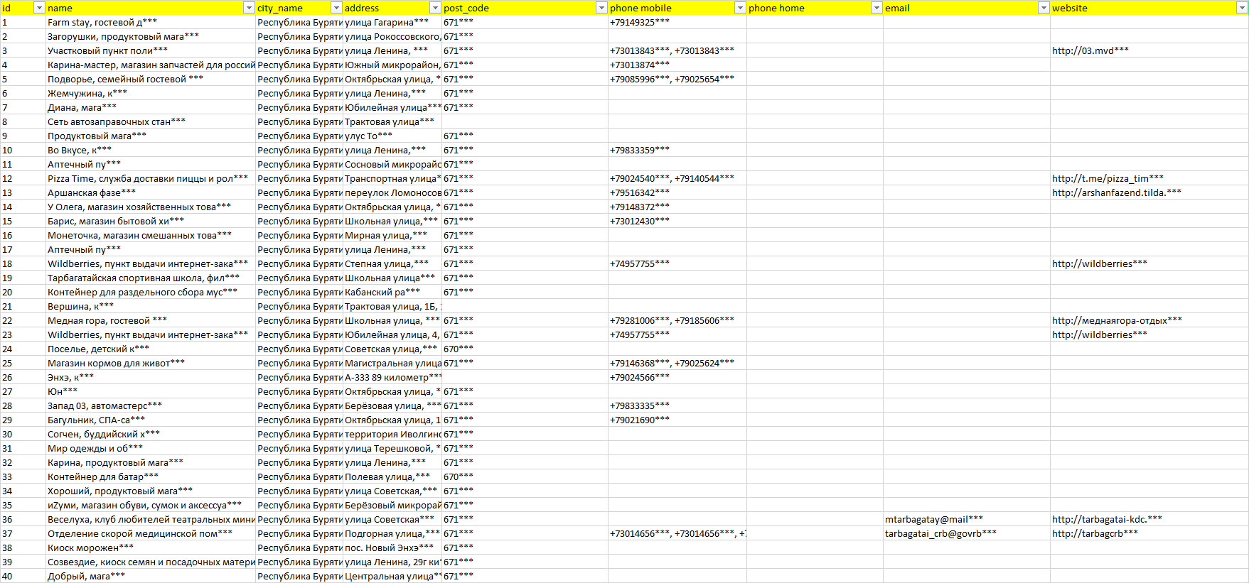 База организаций Республика Бурятия, вся Россия в формате Excel с эл. почтами, телефонами, сайтами, ссылками на соц сети, координатами и другой информацией. Скачайте демо версию, чтобы ознакомиться с данными.