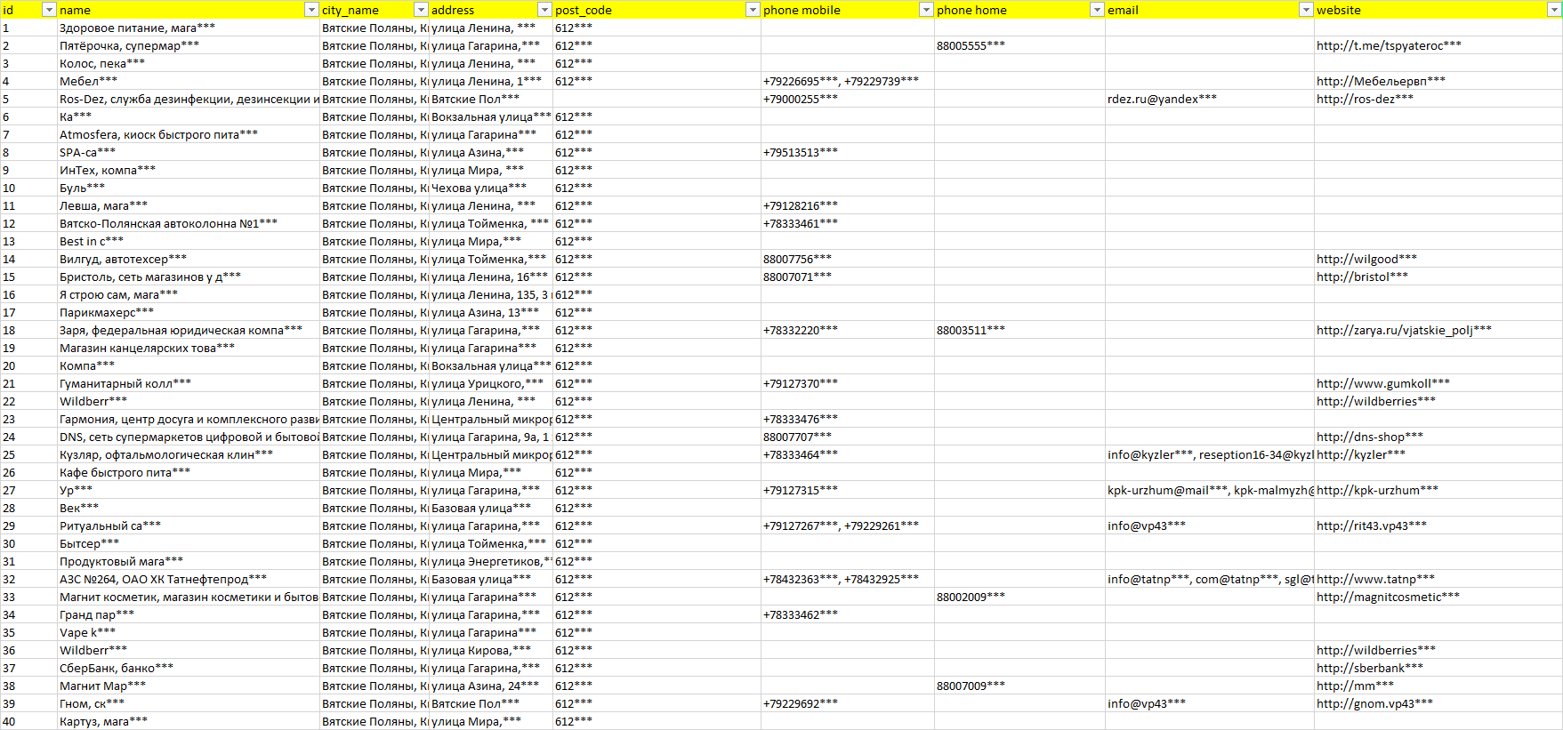 База организаций Вятские Поляны, вся Россия в формате Excel с эл. почтами, телефонами, сайтами, ссылками на соц сети, координатами и другой информацией. Скачайте демо версию, чтобы ознакомиться с данными.
