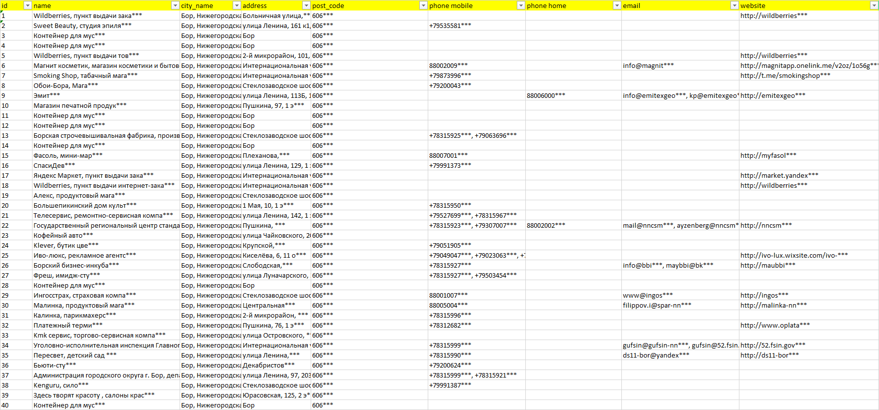 База компаний Бор, вся РФ в формате Excel с эл. почтами, телефонами, сайтами, ссылками на соц сети, координатами и другой информацией. Скачайте демо версию, чтобы ознакомиться с данными.