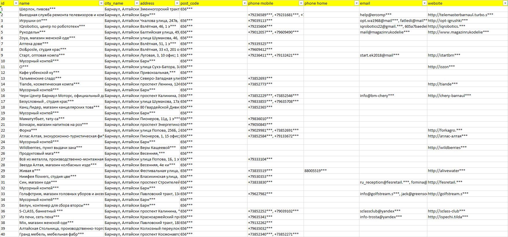 База компаний Барнаул, вся РФ в формате Excel с эл. почтами, телефонами, сайтами, ссылками на соц сети, координатами и другой информацией. Скачайте демо версию, чтобы ознакомиться с данными.