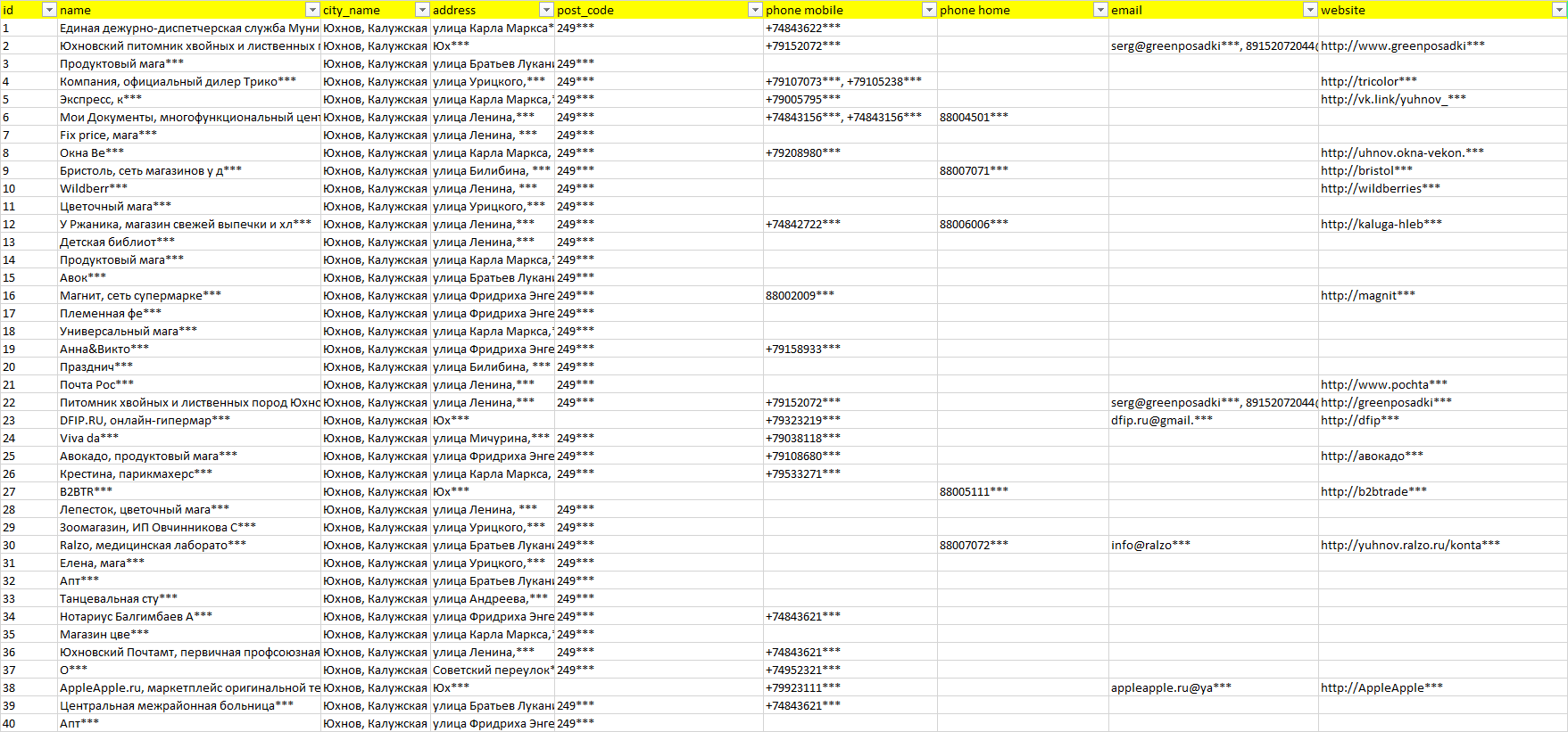 База организаций Юхнов, вся Россия в формате Excel с эл. почтами, телефонами, сайтами, ссылками на соц сети, координатами и другой информацией. Скачайте демо версию, чтобы ознакомиться с данными.