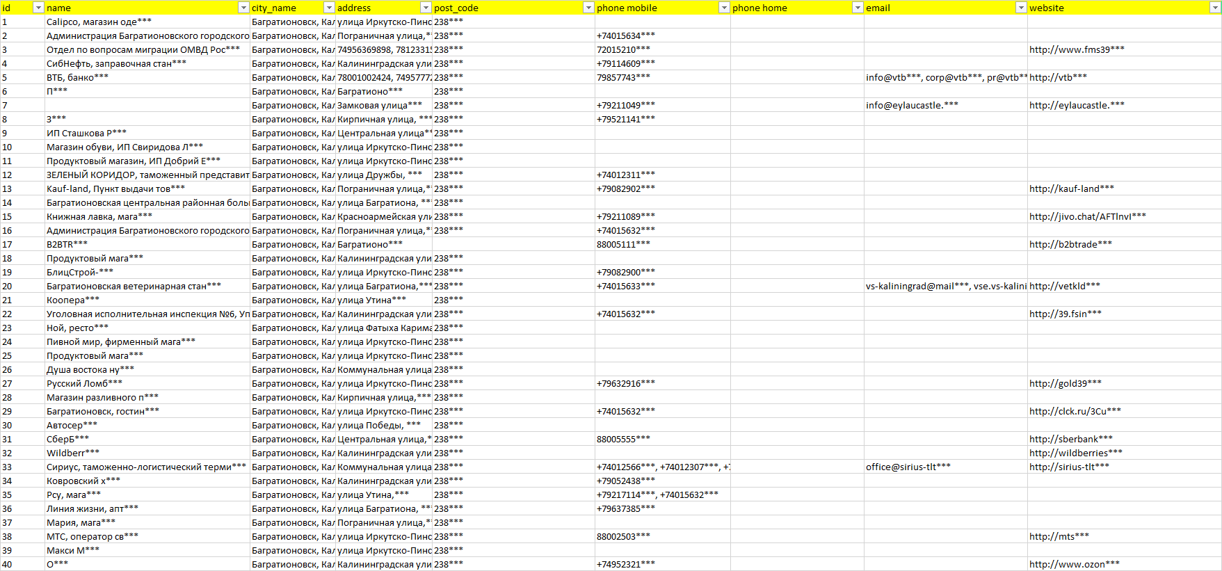 База организаций Багратионовск, вся Россия в формате Excel с эл. почтами, телефонами, сайтами, ссылками на соц сети, координатами и другой информацией. Скачайте демо версию, чтобы ознакомиться с данными.