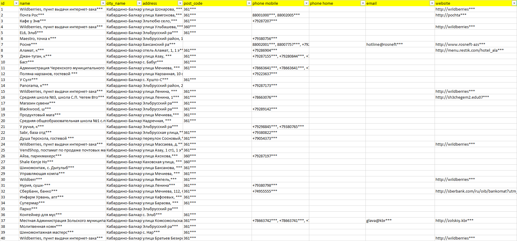 База компаний Кабардино-Балкарская Республика, вся РФ в формате Excel с эл. почтами, телефонами, сайтами, ссылками на соц сети, координатами и другой информацией. Скачайте демо версию, чтобы ознакомиться с данными.