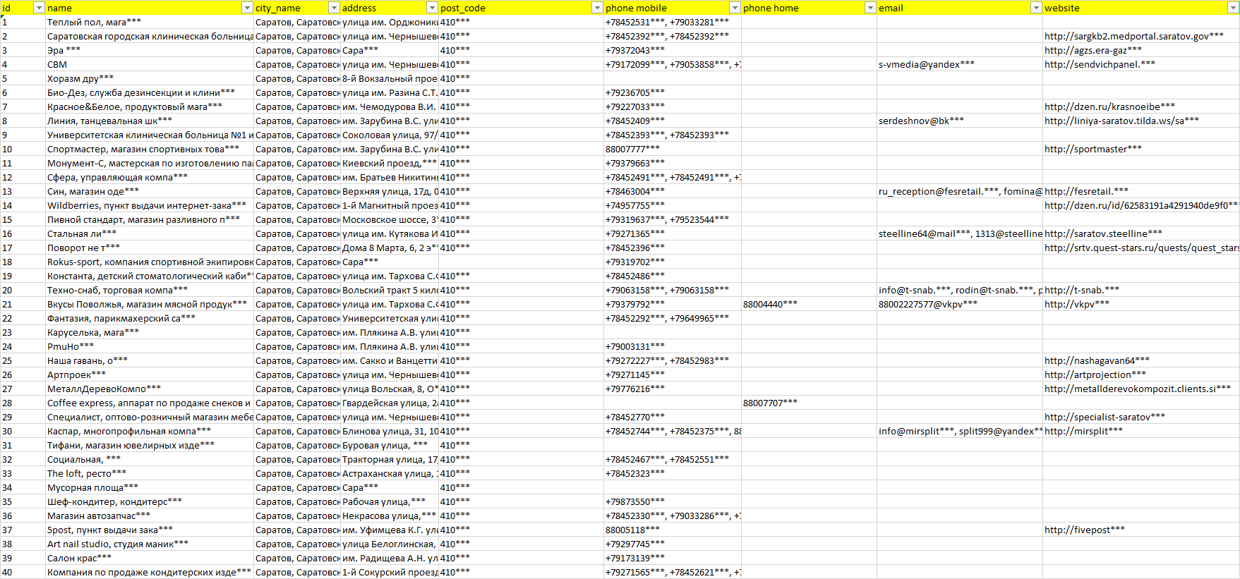 База организаций Саратов, вся Россия в формате Excel с эл. почтами, телефонами, сайтами, ссылками на соц сети, координатами и другой информацией. Скачайте демо версию, чтобы ознакомиться с данными.