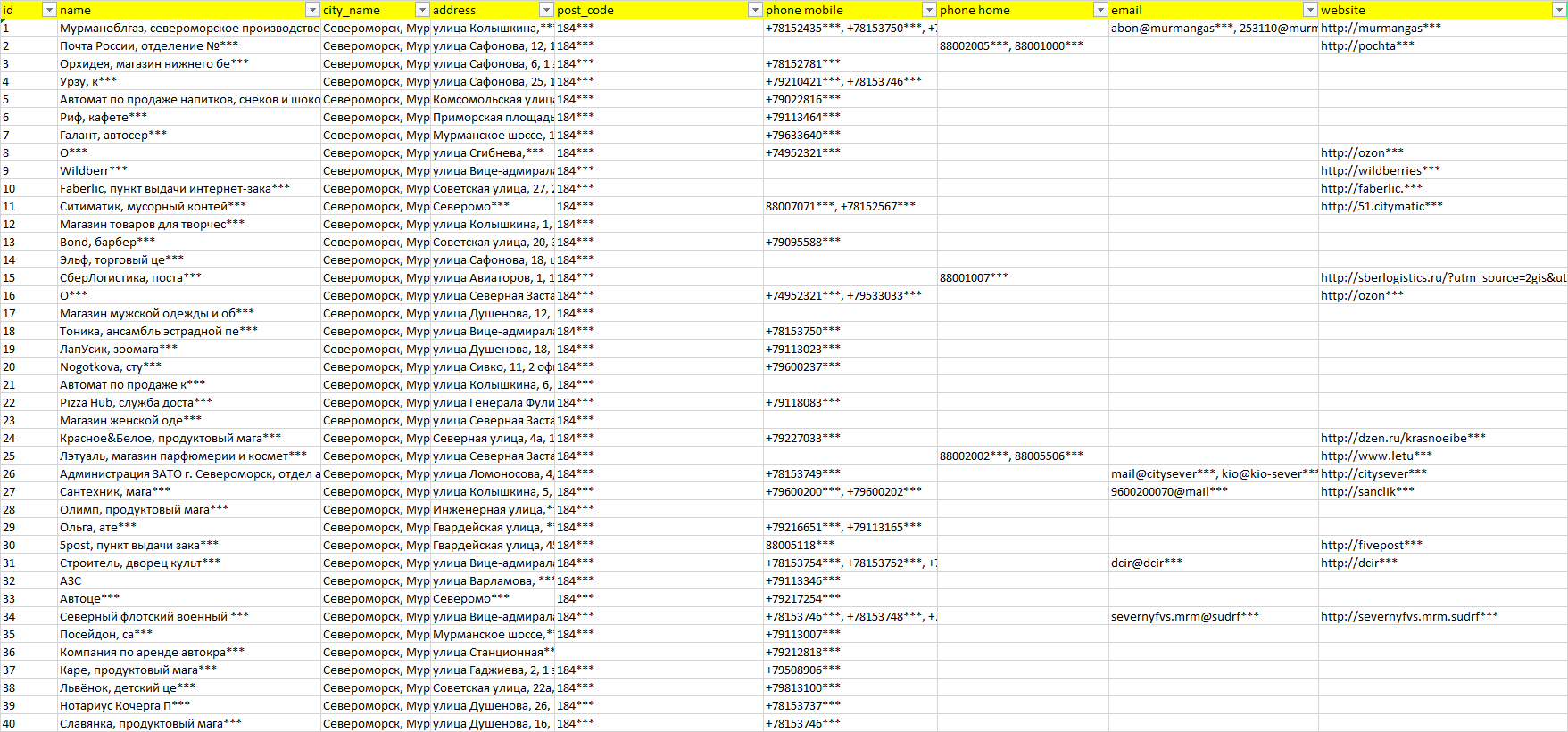 База организаций Североморск, вся Россия в формате Excel с эл. почтами, телефонами, сайтами, ссылками на соц сети, координатами и другой информацией. Скачайте демо версию, чтобы ознакомиться с данными.