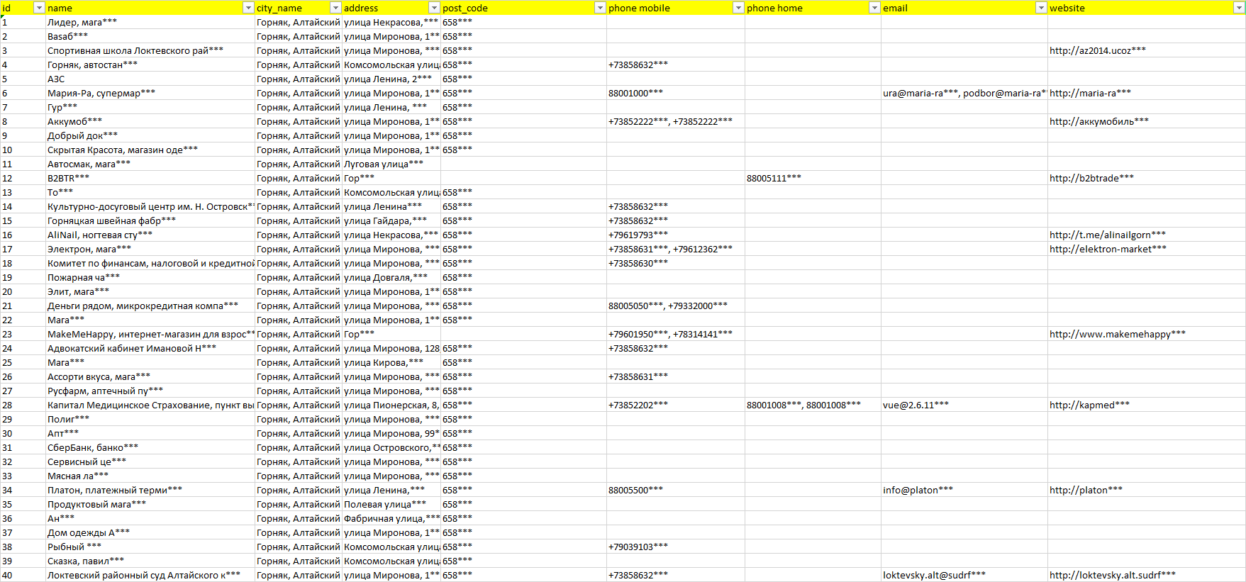 База компаний Горняк, вся РФ в формате Excel с эл. почтами, телефонами, сайтами, ссылками на соц сети, координатами и другой информацией. Скачайте демо версию, чтобы ознакомиться с данными.
