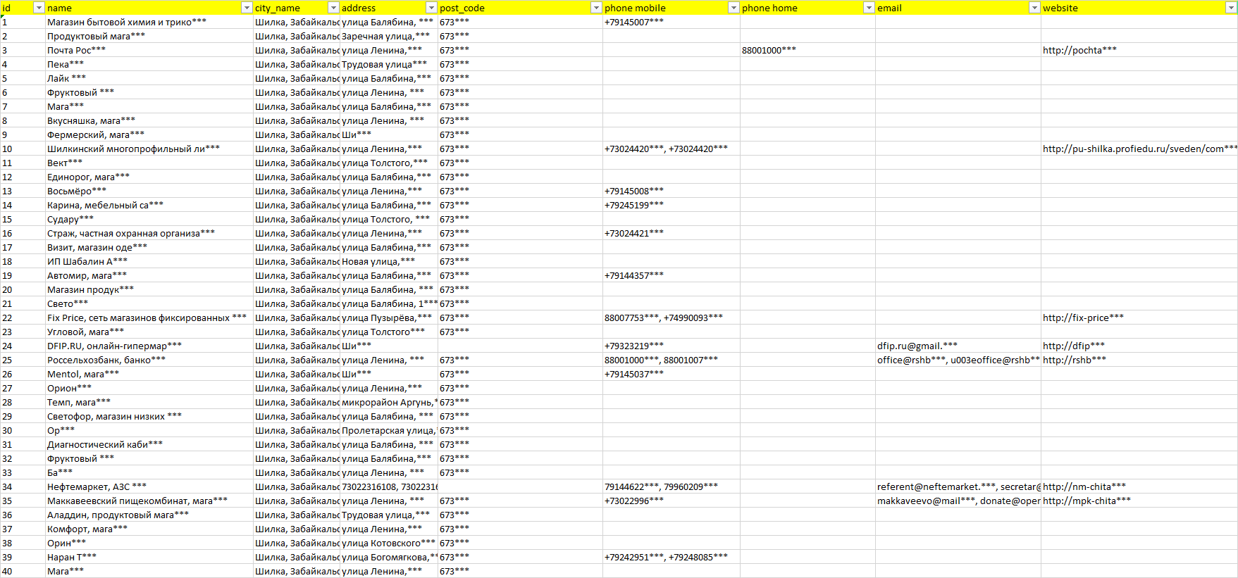 База организаций Шилка, вся Россия в формате Excel с эл. почтами, телефонами, сайтами, ссылками на соц сети, координатами и другой информацией. Скачайте демо версию, чтобы ознакомиться с данными.