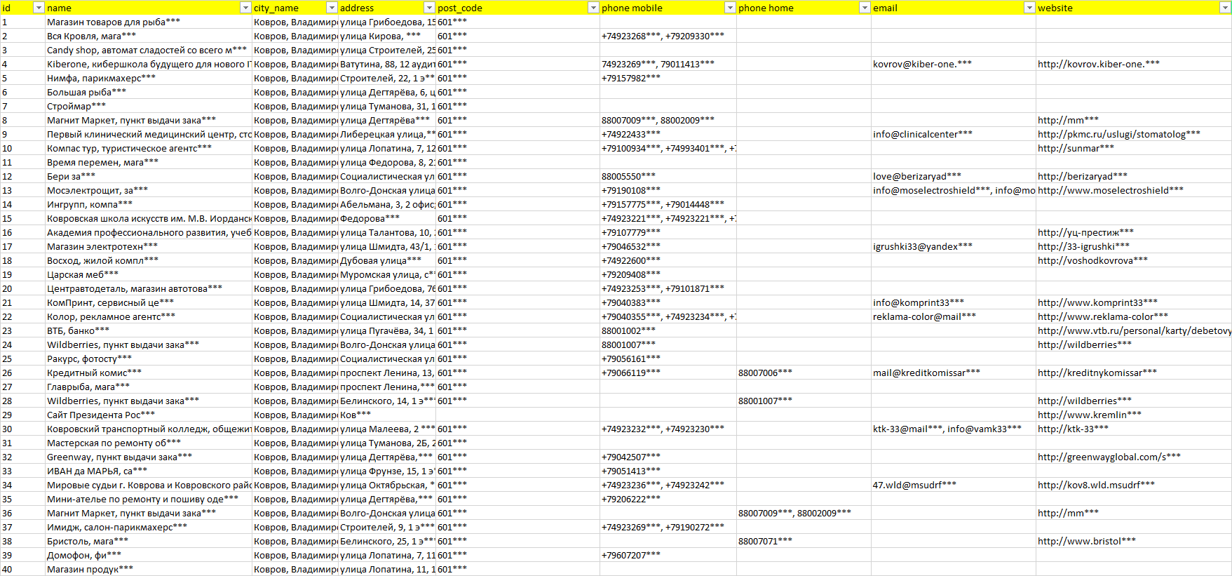 База организаций Ковров, вся Россия в формате Excel с эл. почтами, телефонами, сайтами, ссылками на соц сети, координатами и другой информацией. Скачайте демо версию, чтобы ознакомиться с данными.