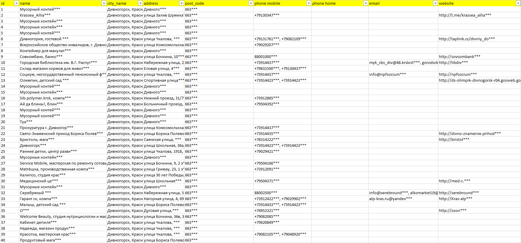 База организаций Дивногорск, вся Россия в формате Excel с эл. почтами, телефонами, сайтами, ссылками на соц сети, координатами и другой информацией. Скачайте демо версию, чтобы ознакомиться с данными.