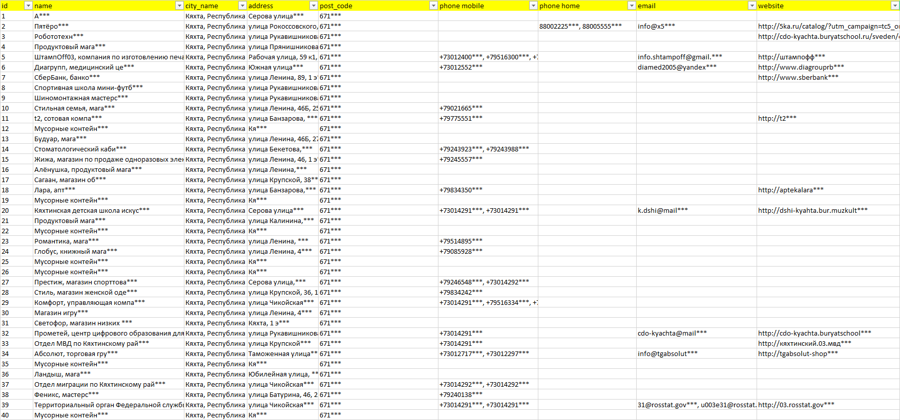 База организаций Кяхта, вся Россия в формате Excel с эл. почтами, телефонами, сайтами, ссылками на соц сети, координатами и другой информацией. Скачайте демо версию, чтобы ознакомиться с данными.