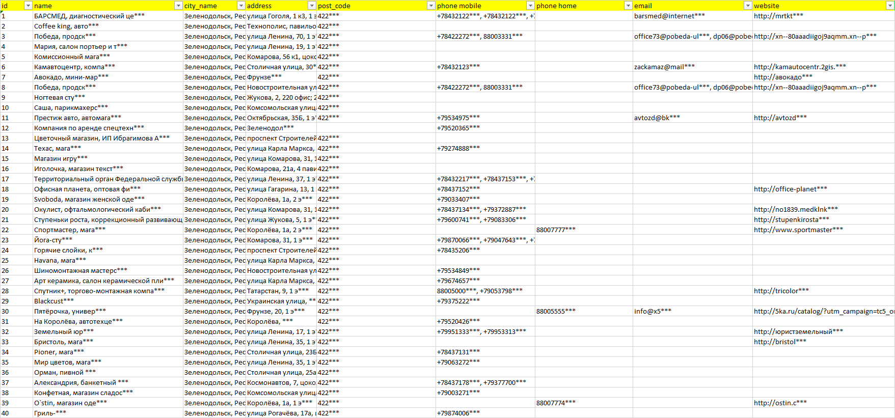 База организаций Зеленодольск, вся Россия в формате Excel с эл. почтами, телефонами, сайтами, ссылками на соц сети, координатами и другой информацией. Скачайте демо версию, чтобы ознакомиться с данными.